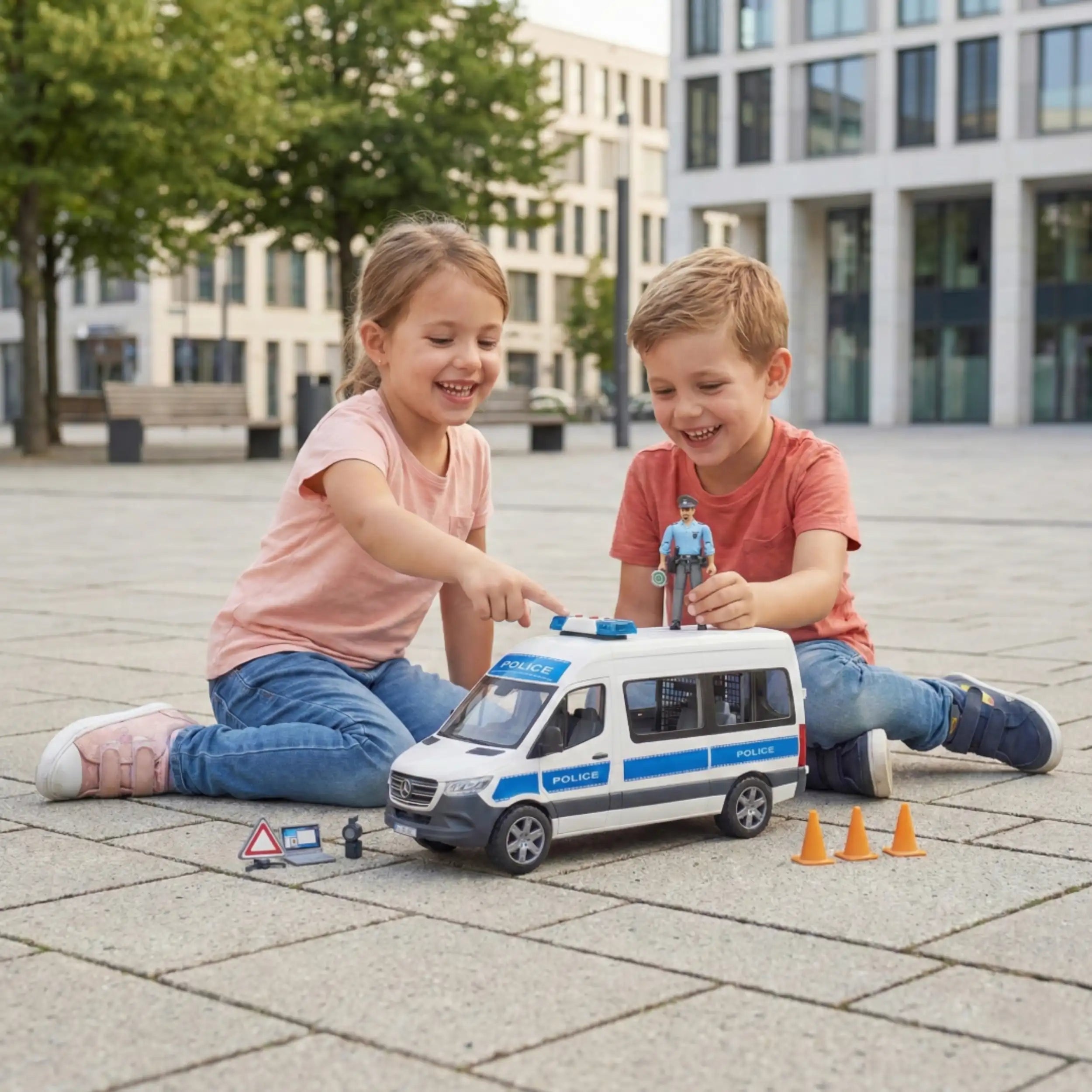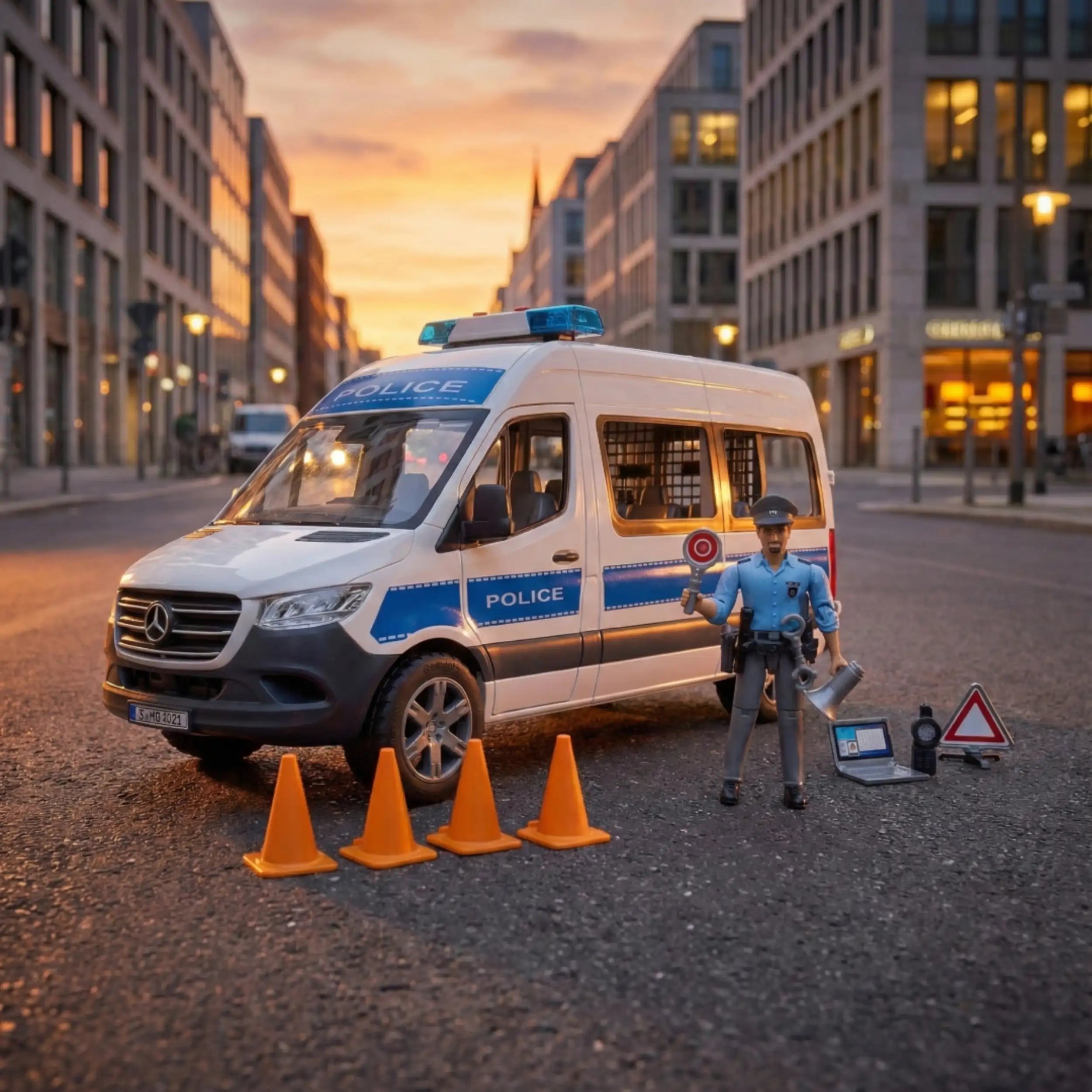 Bruder MB Sprinter police vehicle toy with officer, cones, laptop, and sign, featuring realistic details for imaginative play.