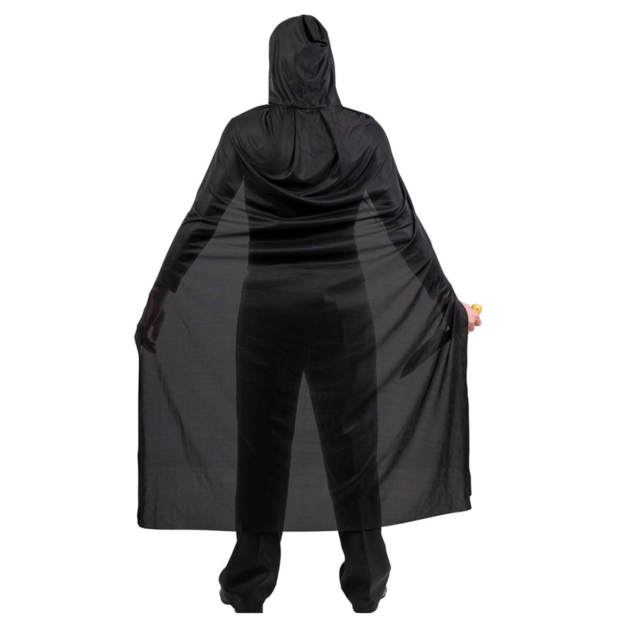 The Adult Ghost Costume Set features a flowing black jersey fabric cloak that measures an impressive 130 cm in length. This dramatic cloak not only adds an air of mystery but also provides comfort and ease of movement, allowing you to fully immerse yourself in your ghostly persona. The attached hood enhances the haunting look, shrouding your face in shadow and adding to the overall effect of the costume.
