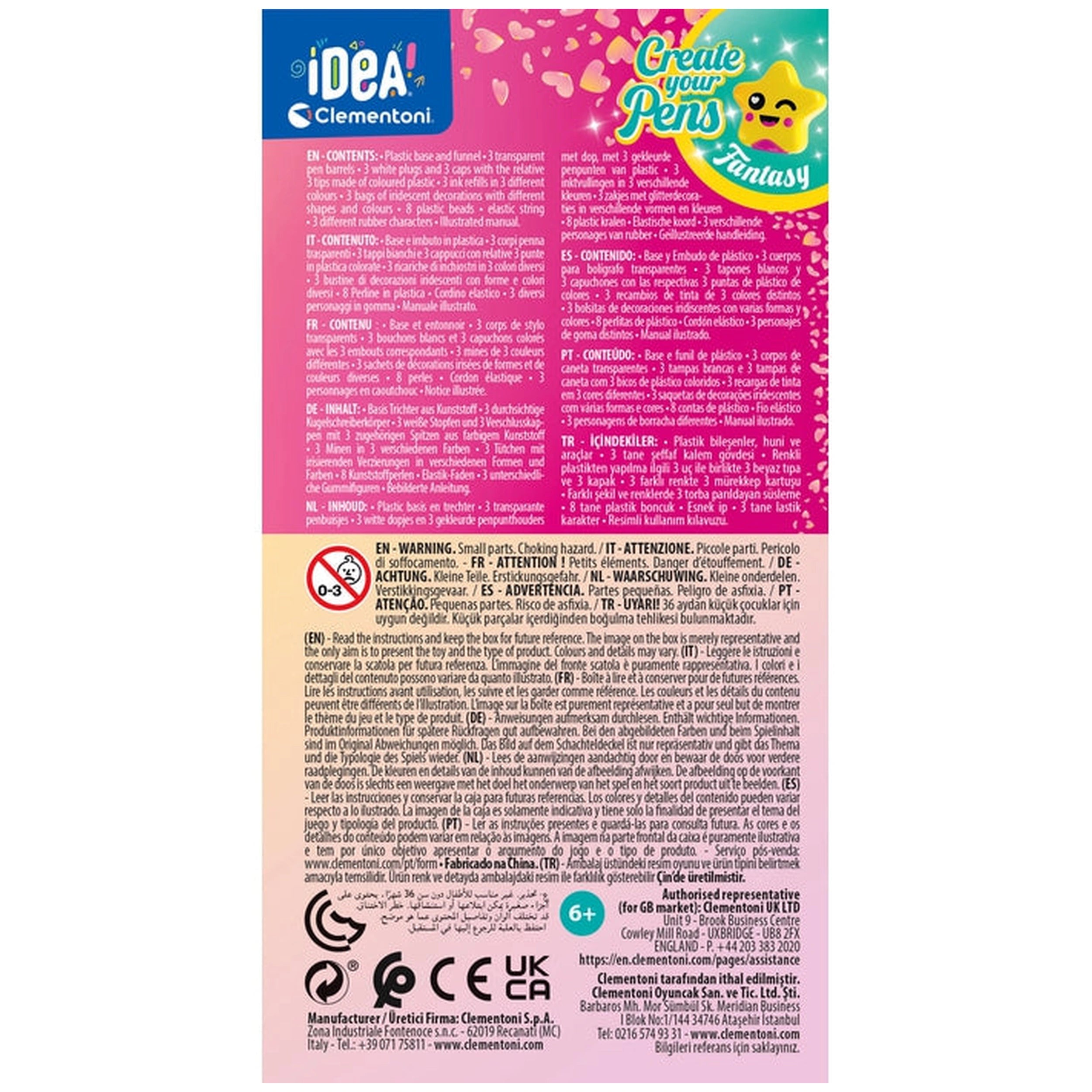 Clementoni - IDEA Create your Pens Fantasy - Arts-&-Crafts Presentiamo il Clementoni - IDEA Create your Pens Fantasy, un kit di arti e mestieri unico e coinvolgente progettato per ispirare la creatività nei bambini dai sei anni in su. Questo prodotto innovativo consente ai giovani artisti di assemblare e personalizzare tre penne, trasformandole in strumenti di scrittura magici adornati con varie decorazioni a tema fantasy. Con il suo focus sul gioco immaginativo, questo kit incoraggia i bambini a esprimersi mentre sviluppano abilità motorie fini e artistiche. Il kit Clementoni Create your Pens Fantasy include tutto il necessario per un'esperienza di crafting deliziosa. All'interno della scatola splendidamente progettata, troverai tre penne di alta qualità, quattro colori di inchiostro vivaci e tre affascinanti personaggi per arricchire il processo di personalizzazione. Ogni componente è pensato con cura per garantire che i bambini possano assemblare e decorare facilmente le loro penne, rendendolo una scelta ideale sia per il gioco individuale che per le attività di gruppo. Ciò che distingue questo kit è l'accento sulla creatività e sull'autoespressione. I bambini possono mescolare e abbinare accessori, sperimentare con i colori e lasciare correre la loro immaginazione mentre creano design di penne unici che riflettono le loro personalità. Questa attività pratica non solo offre ore di intrattenimento, ma favorisce anche un senso di realizzazione mentre i bambini vedono le loro idee prendere vita. Progettato e sviluppato in Italia, il kit Clementoni Create your Pens Fantasy incarna qualità e innovazione. I materiali utilizzati sono sicuri e durevoli, garantendo che l'esperienza di crafting sia sia piacevole che sicura. I genitori possono sentirsi sicuri nel fornire ai propri figli un prodotto che non solo intrattiene, ma supporta anche il loro sviluppo attraverso il gioco creativo. Le dimensioni compatte della scatola (10 x 18,5 x 4 cm) la rendono facile da riporre e trasportare, permettendo divertimento creativo a casa o in viaggio. Pesando solo 111 grammi, questo kit è leggero e conveniente, rendendolo un regalo perfetto per compleanni, festività o qualsiasi occasione speciale. Non perdere l'opportunità di accendere la creatività di tuo figlio con il kit Clementoni - IDEA Create your Pens Fantasy. Ordina ora e guarda mentre intraprendono un viaggio magico di espressione artistica, creando penne personalizzate che sono davvero uniche!