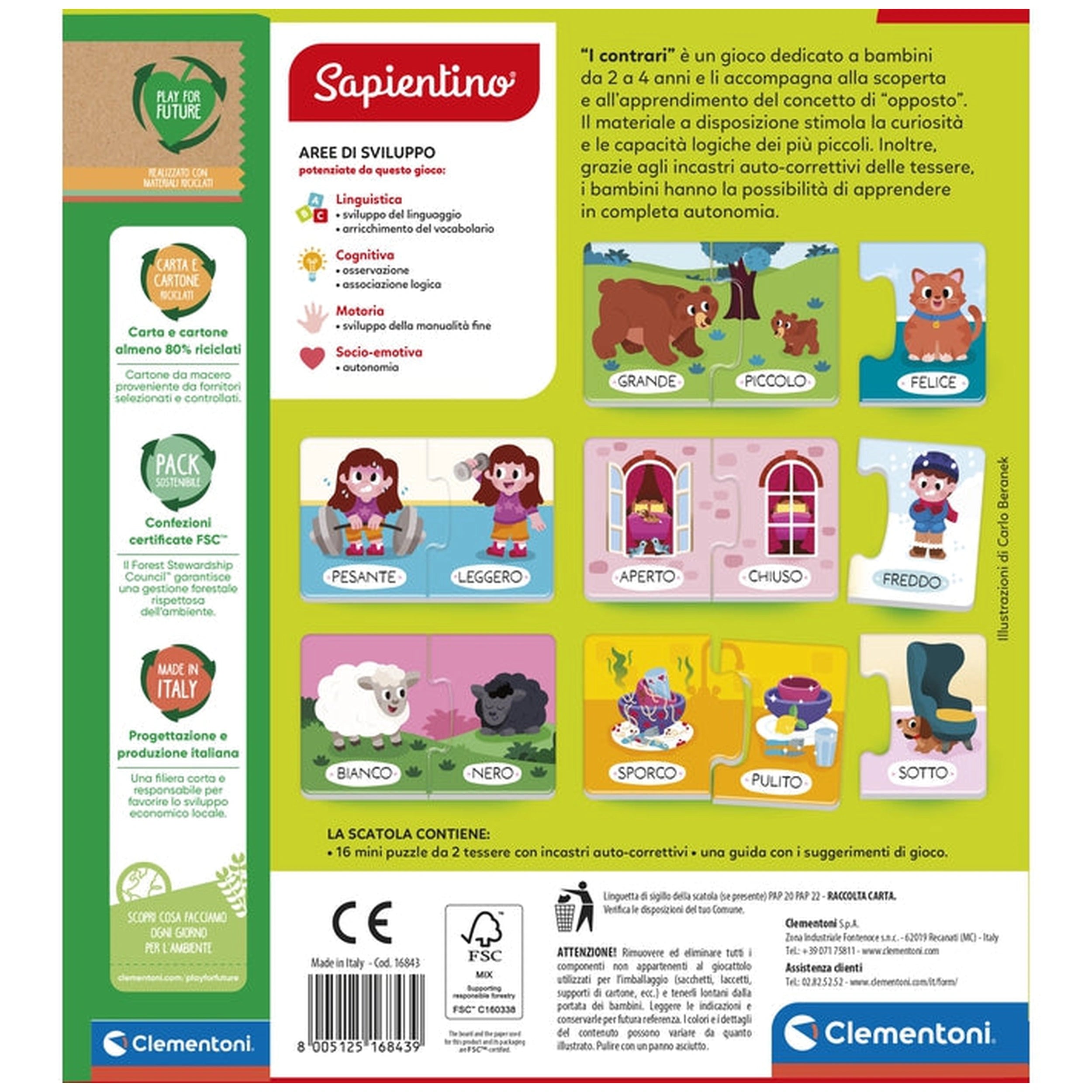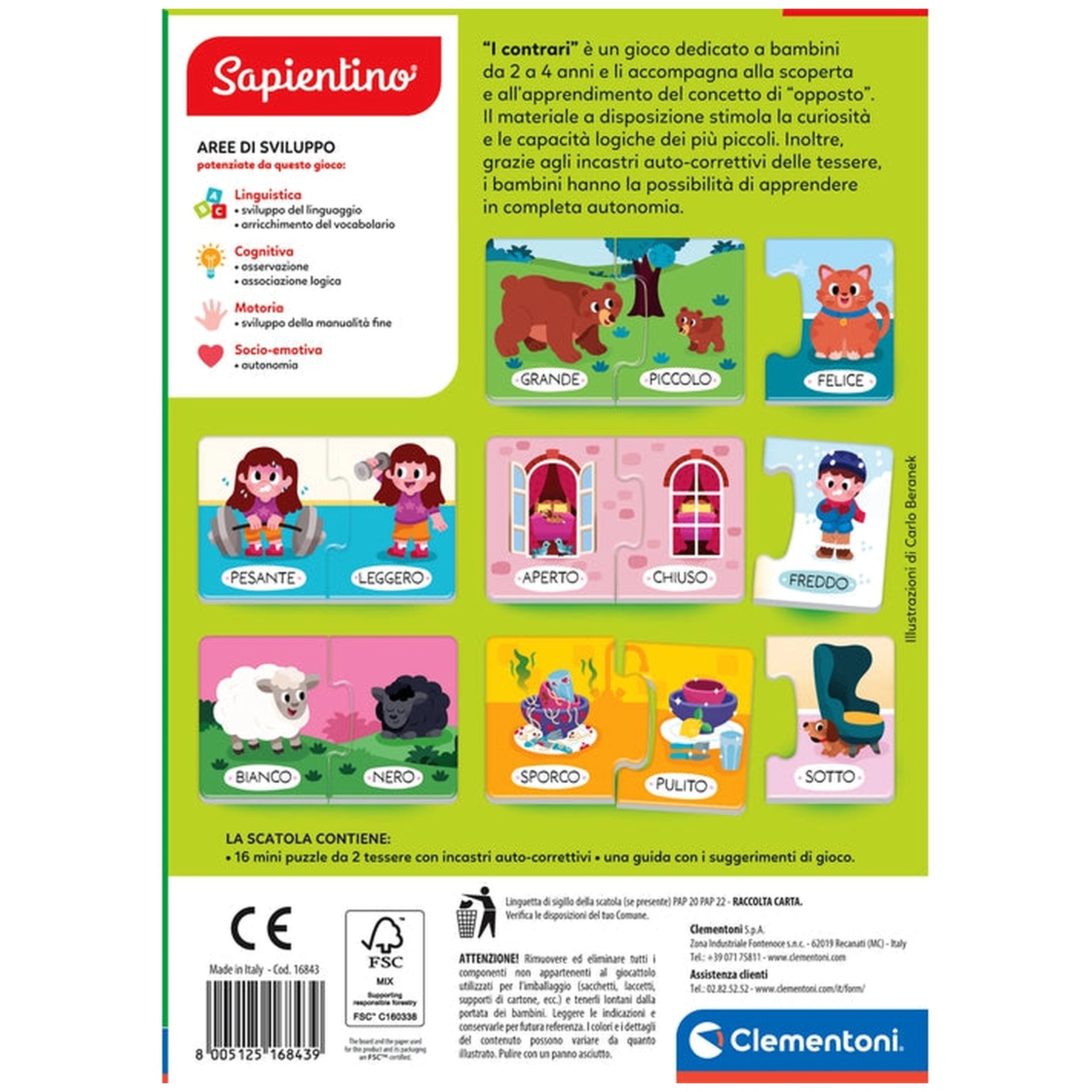 Clementoni - Sapientino I Contrari - Giocattoli Educativi Presentiamo il Clementoni - Sapientino I Contrari, un eccezionale giocattolo educativo progettato per introdurre i bambini piccoli nel affascinante mondo dei contrari. Questo gioco in edizione italiana è meticolosamente realizzato per coinvolgere i bambini dai 2 ai 4 anni, offrendo loro un modo divertente e interattivo per apprendere abilità cognitive e linguistiche essenziali. Con le sue illustrazioni vivaci e il design intuitivo, questo giocattolo non solo intrattiene ma educa anche, rendendolo un'aggiunta perfetta alla routine di gioco di ogni bambino. Il Clementoni - Sapientino I Contrari presenta 16 bellissimi puzzle a due pezzi illustrati, progettati specificamente con incastri autocorrettivi. Questo design innovativo consente ai bambini di giocare in modo indipendente, favorendo un senso di autonomia e fiducia mentre esplorano il concetto di contrari. Ogni pezzo del puzzle è realizzato per incastrarsi perfettamente, assicurando che i bambini possano facilmente riconoscere e comprendere le relazioni tra diverse coppie di contrari, come caldo e freddo, grande e piccolo, e altro ancora. Oltre a migliorare il vocabolario e le abilità linguistiche, questo giocattolo educativo supporta lo sviluppo del pensiero logico e delle capacità cognitive. Mentre i bambini interagiscono con i puzzle, sono incoraggiati a pensare criticamente sulle relazioni tra i concetti, creando una solida base per l'apprendimento futuro. La natura interattiva del gioco promuove le abilità di problem-solving e incoraggia i bambini a esprimere i propri pensieri e idee, rendendolo uno strumento prezioso per lo sviluppo della prima infanzia. Clementoni è rinomata per il suo impegno nella qualità e nel valore educativo, e il Sapientino I Contrari non fa eccezione. Progettato, sviluppato e realizzato in Italia, questo giocattolo riflette la dedizione del marchio nella creazione di prodotti educativi di alta qualità che siano sia coinvolgenti che efficaci. I genitori possono fidarsi di fornire ai propri figli un giocattolo che non solo intrattiene ma contribuisce anche alla loro crescita e sviluppo complessivi. Le dimensioni compatte del prodotto (25,2 x 18 x 4,5 cm) e il suo design leggero (426 grammi) lo rendono facile da riporre e trasportare, consentendo il gioco anche in movimento. Che sia a casa, al parco o durante i viaggi, i bambini possono divertirsi ad apprendere i contrari ovunque si trovino. Questa versatilità assicura che l'apprendimento non si fermi mai e che i bambini possano continuare a esplorare nuovi concetti in vari ambienti. Non perdere l'opportunità di arricchire l'esperienza di apprendimento di tuo figlio con il Clementoni - Sapientino I Contrari. Esplora l'intera gamma di giochi educativi Clementoni progettati per ogni fase dello sviluppo di un bambino. Investi nel futuro di tuo figlio oggi aggiungendo questo giocattolo coinvolgente ed educativo alla sua collezione. Ordina ora e osserva mentre intraprendono un delizioso viaggio di scoperta e apprendimento!