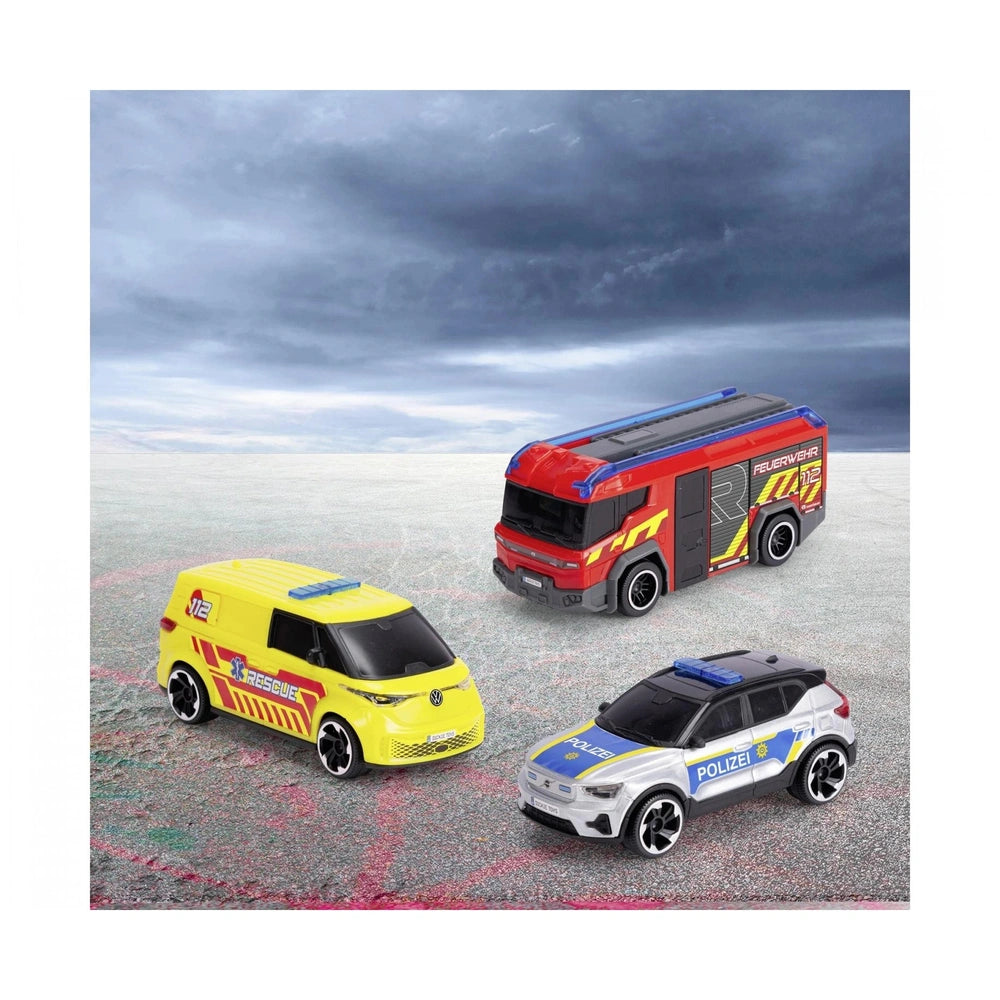 Introducing the Dickie Toys SOS Team Play Vehicle set, a thrilling collection designed to ignite the imagination of young adventurers. This set features three meticulously crafted freewheel cars, each measuring 15 cm, making them perfect for little hands eager to embark on rescue missions. The set includes a Volvo EX40 police car, a VW ID. Buzz ambulance, and a Rosenbauer Penta fire engine, all of which are officially licensed replicas of real-life vehicles. Ideal for children aged three and above, this playset promises endless fun and excitement.