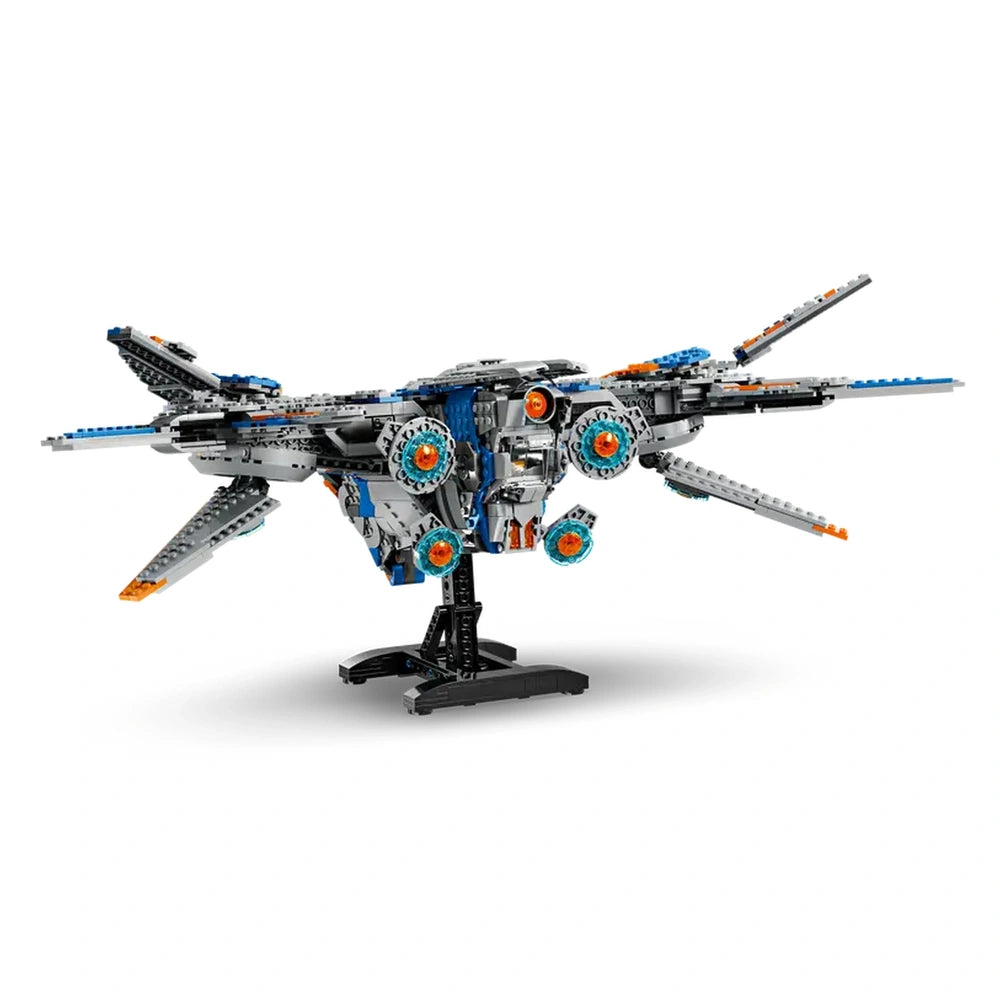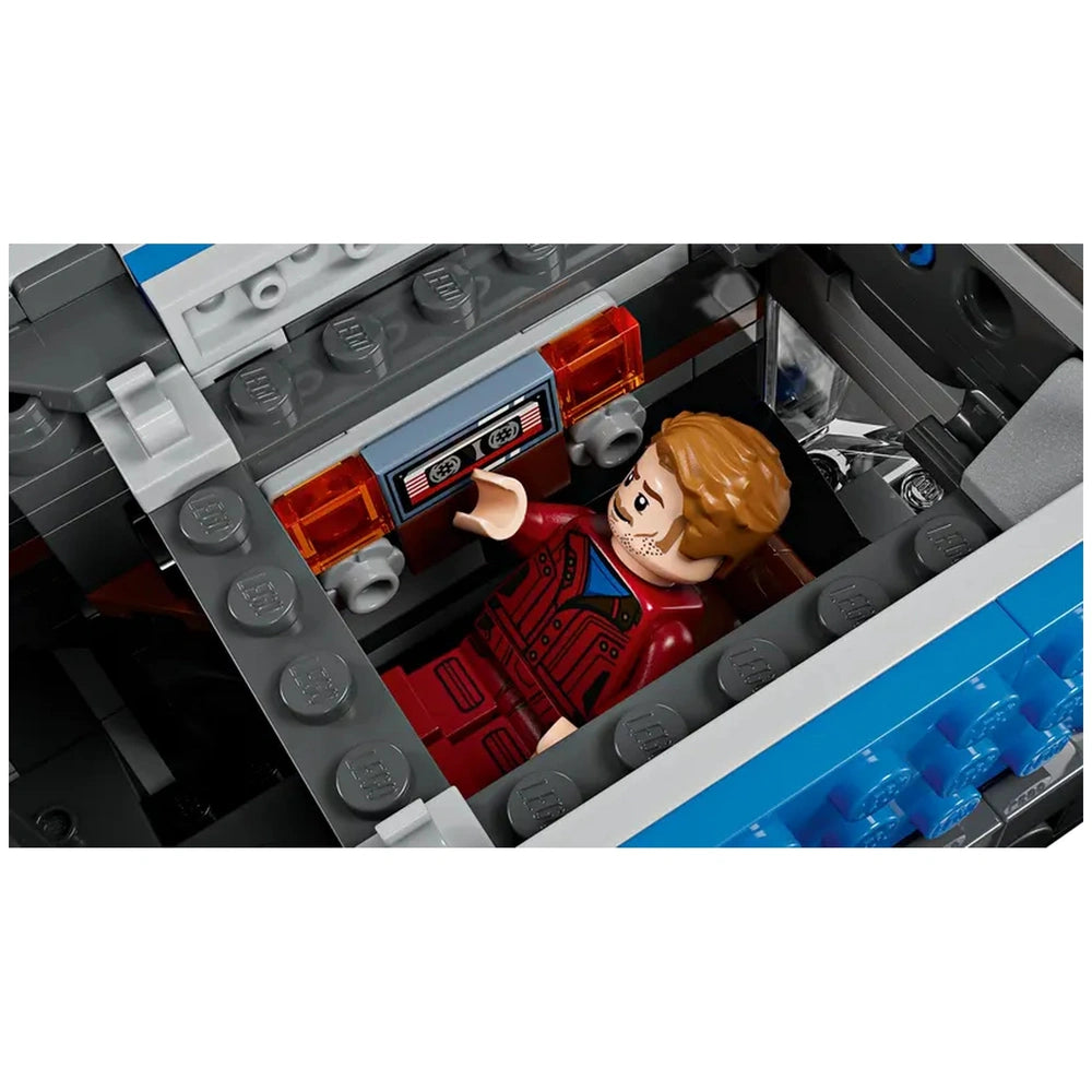 The Milano construction set is a remarkable tribute to the iconic starship from the first Guardians of the Galaxy movie. This impressive model boasts six adjustable wings and four movable rear boosters, allowing builders to customize the ship's appearance and engage in imaginative play. The top of the spaceship lifts off to unveil a richly detailed interior, featuring three distinct areas: a flight deck that accommodates three minifigures, a communal area with additional seating and storage for weapons, and a cozy rest area complete with a bed and a nostalgic tape deck, reminiscent of the film's memorable soundtrack.