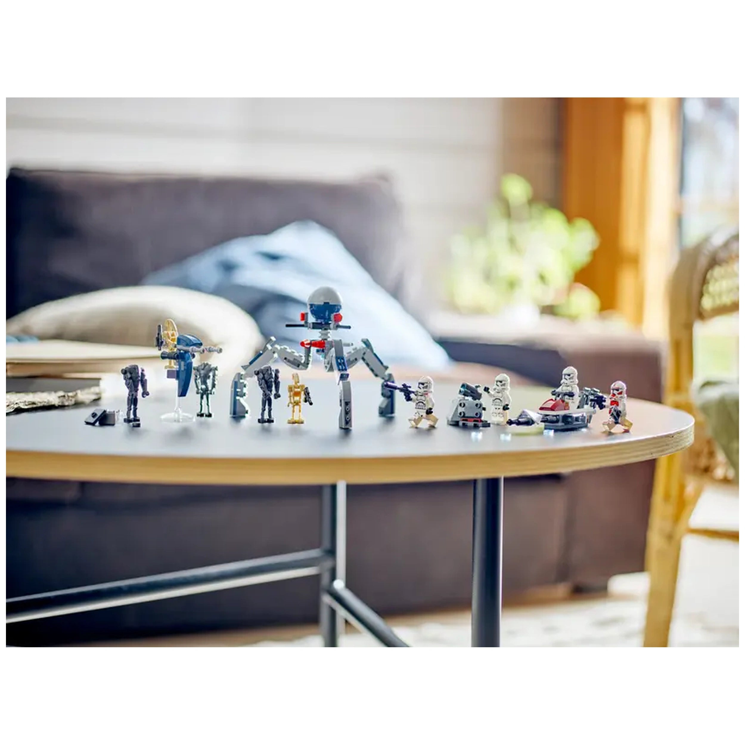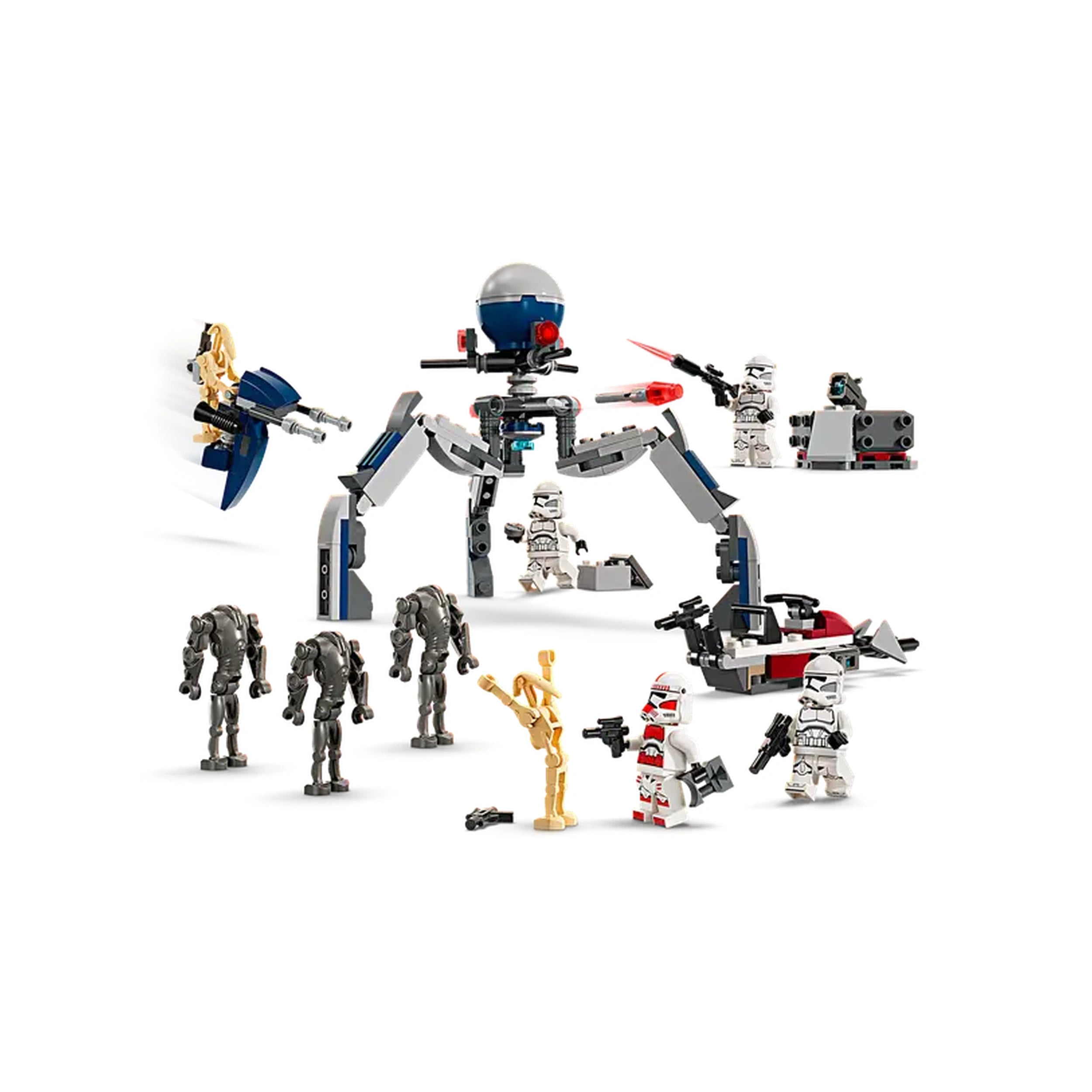 The LEGO Clone Trooper & Battle Droid Battle Pack features a total of 4 LEGO Star Wars minifigures and 5 additional LEGO figures, including a Clone Shock Trooper, three Clone Troopers, three Super Battle Droids, and two Battle Droids. Each character comes equipped with iconic weapons, allowing for dynamic action play that mirrors the epic battles seen in the series. The inclusion of these detailed figures not only enhances the play experience but also encourages storytelling and role-playing among young fans.