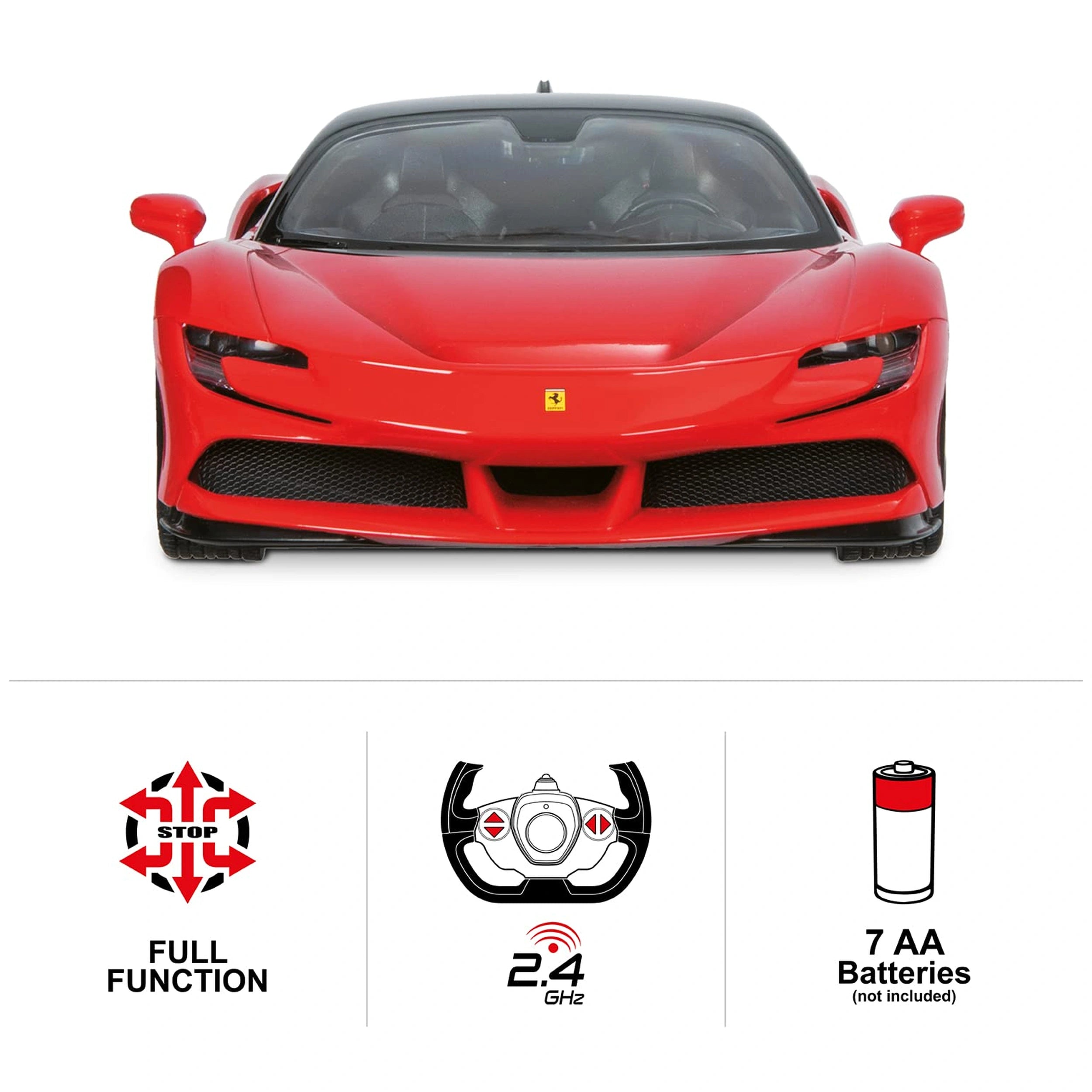 Introducing the Mondo - Ferrari SF 90 Radio-Controlled 2.4 GHz 1:14 Full Function Play Vehicle, a remarkable toy that brings the thrill of high-performance racing right into your child's hands. Designed for young automotive enthusiasts, this meticulously crafted remote-controlled model replicates the iconic Ferrari SF90 Stradale, one of the most advanced and powerful vehicles ever produced by the legendary Italian manufacturer. With its stunning attention to detail and realistic scale, this toy promises an engaging and exhilarating play experience.