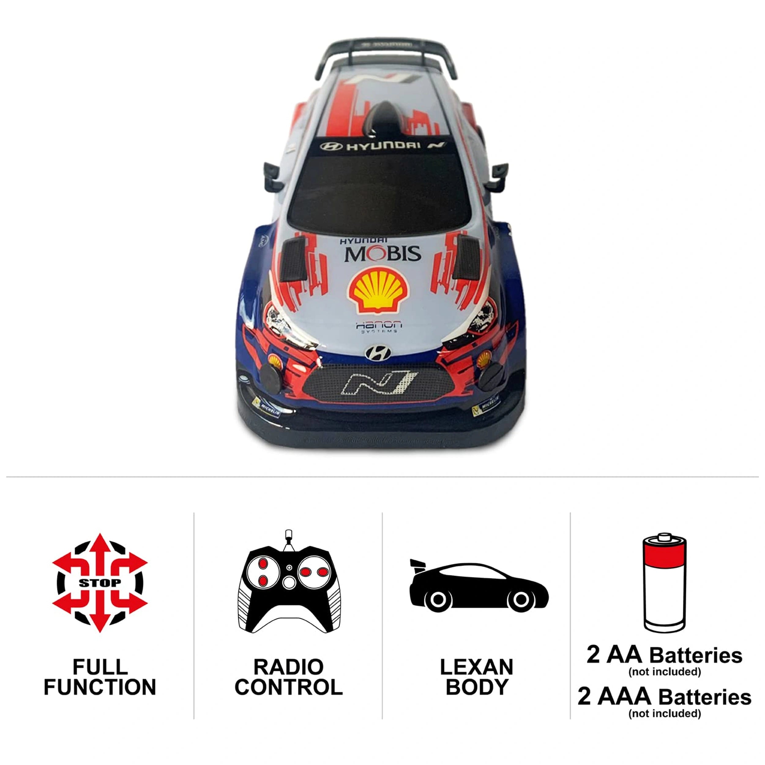 Introducing the Mondo Hyundai I20 WRC Radio-Controlled 2.4 GHz 1:28 Full Function with Lexan Body, a thrilling toy designed for young racing enthusiasts. This meticulously crafted miniature model brings the excitement of World Rally Championship racing right into your living room. With its stunning attention to detail and high-performance features, this radio-controlled car is perfect for children who dream of speed and adventure.