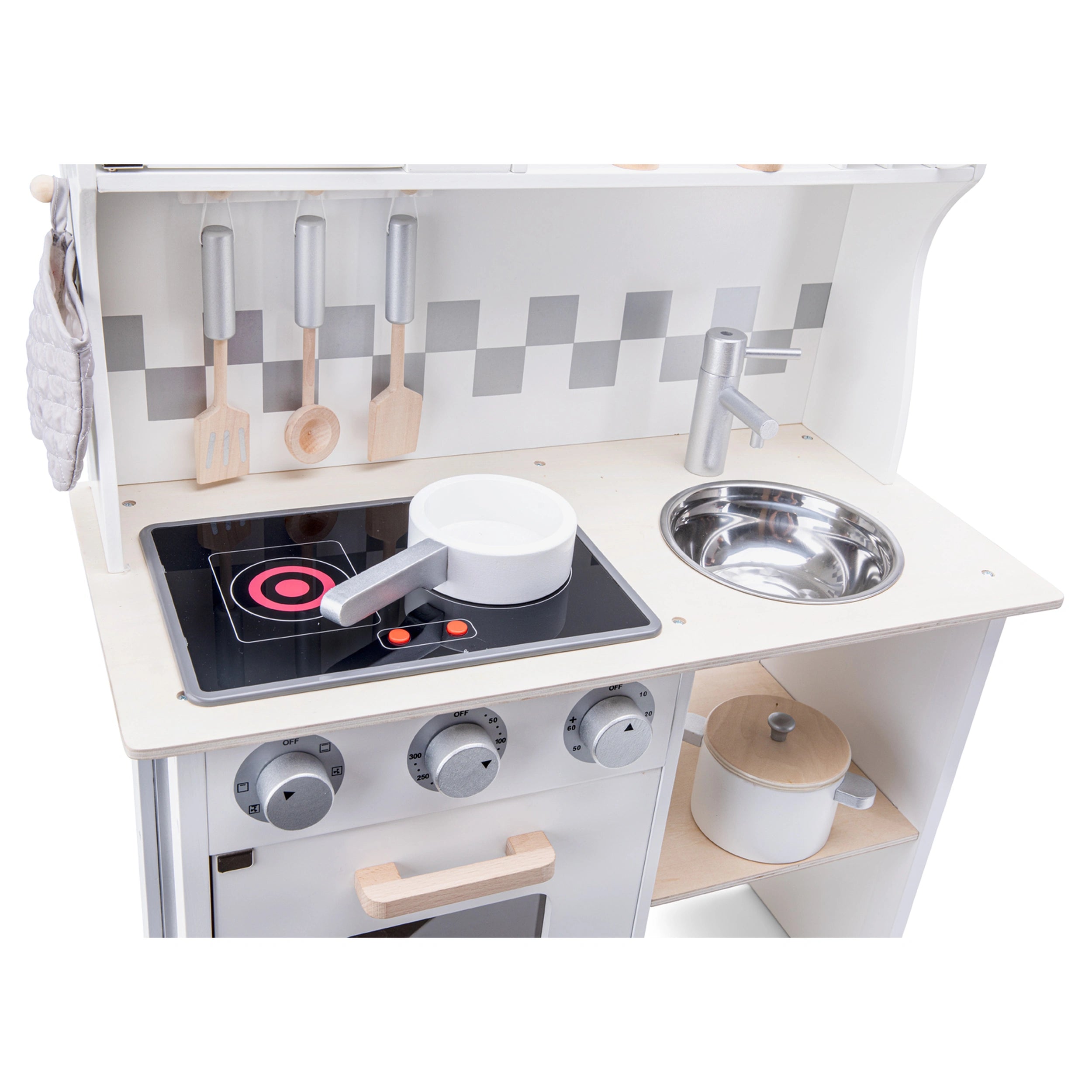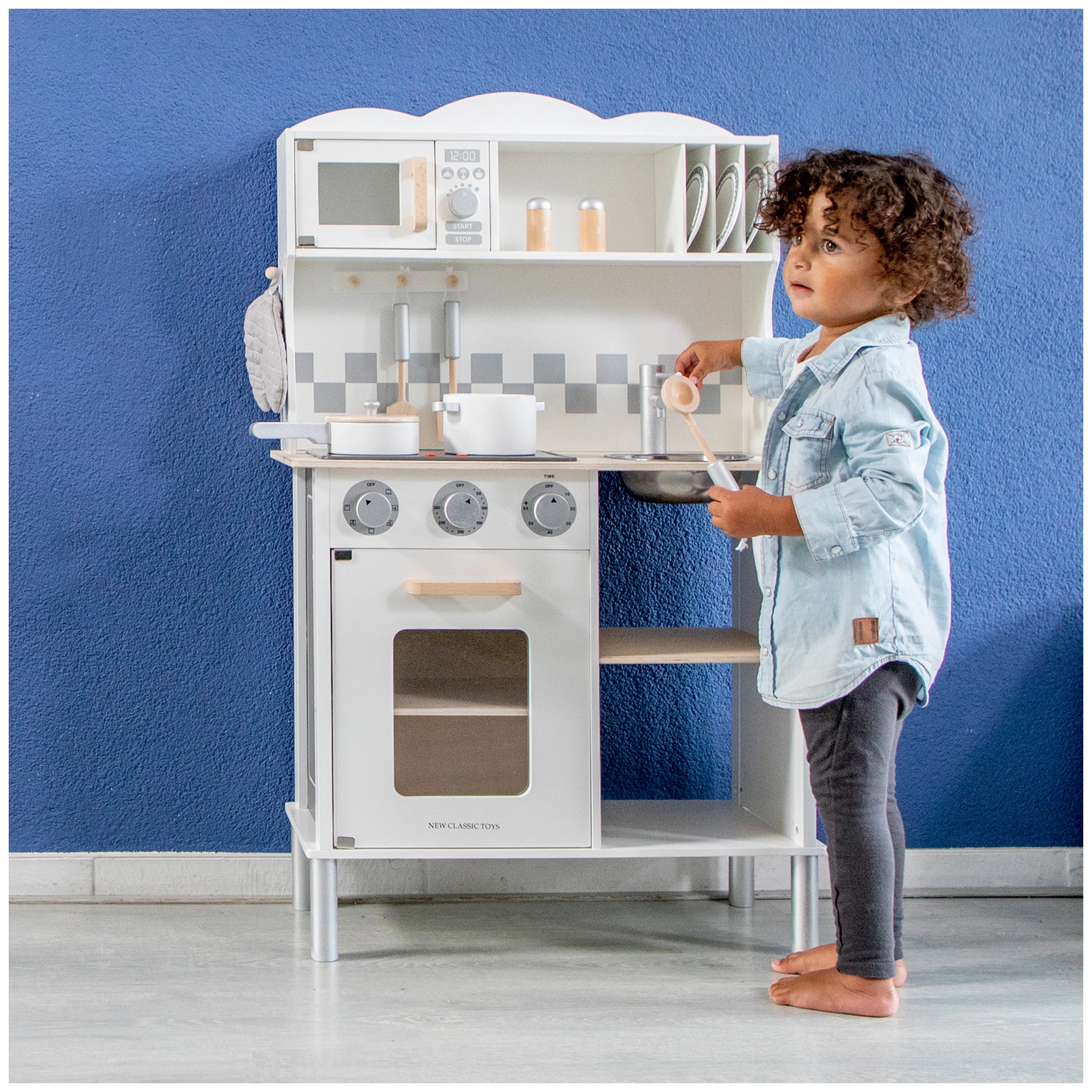 Introducing the New Classic Toys Kitchenette – a modern electric cooking playset designed to ignite the culinary creativity of young chefs. This delightful kitchen, adorned in a sleek white finish, is not just a toy; it's an imaginative space where children can explore the art of cooking through role play. With its charming design and comprehensive accessories, the Kitchenette is the perfect addition to any playroom, encouraging children to engage in hours of fun while developing essential life skills.