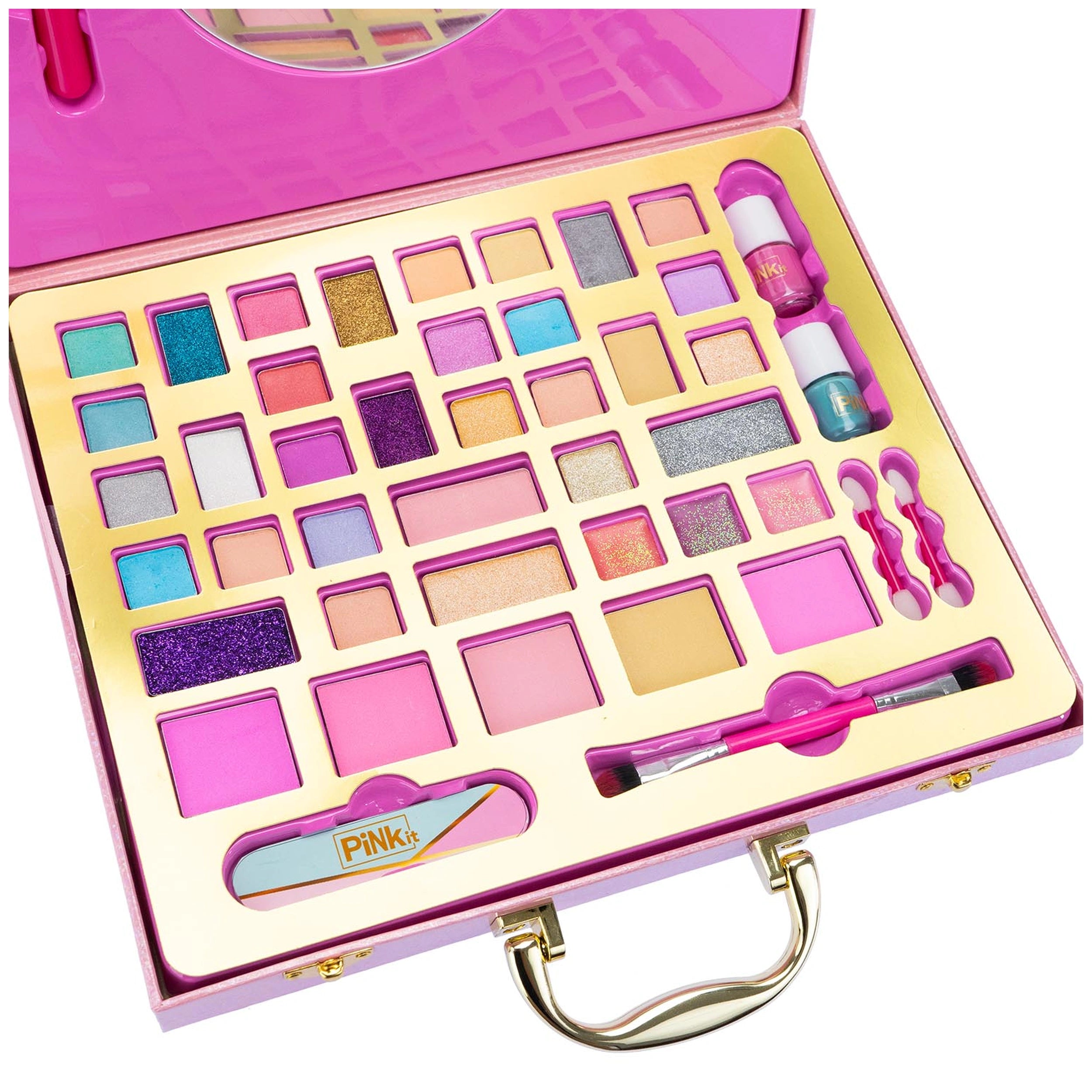 Included in this makeup suitcase are essential tools and products that cater to all aspects of beauty. The kit features a mirror for easy application, a nail file for perfect manicures, and two oil-based nail polishes for a polished finish. Additionally, you will find a dual-ended brush for versatile application, a wide brush for blending, and a selection of five blushes, three lip glosses, and an extensive range of eyeshadows, including six glitter shades, six pearl shades, and eighteen pastel shades. This diverse collection allows for endless creativity and experimentation with different looks.