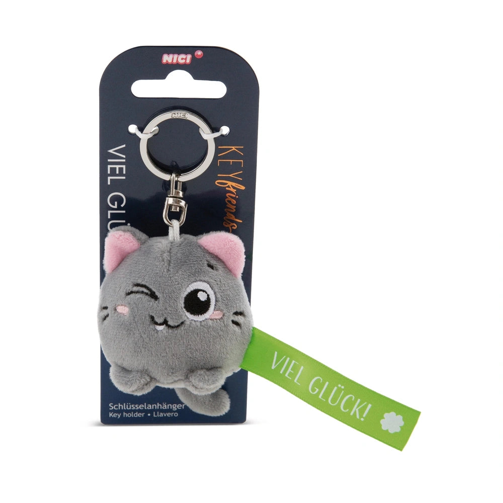 Introducing the NICI Key Friends - Keyholder Green Cat, a delightful accessory that combines functionality with charm. This adorable plush kitten pendant is designed to be your daily companion, bringing joy and positivity wherever you go. With its unique design featuring a grey cat with a playful winking eye, this keyholder is not just a practical item but also a source of happiness and good luck.