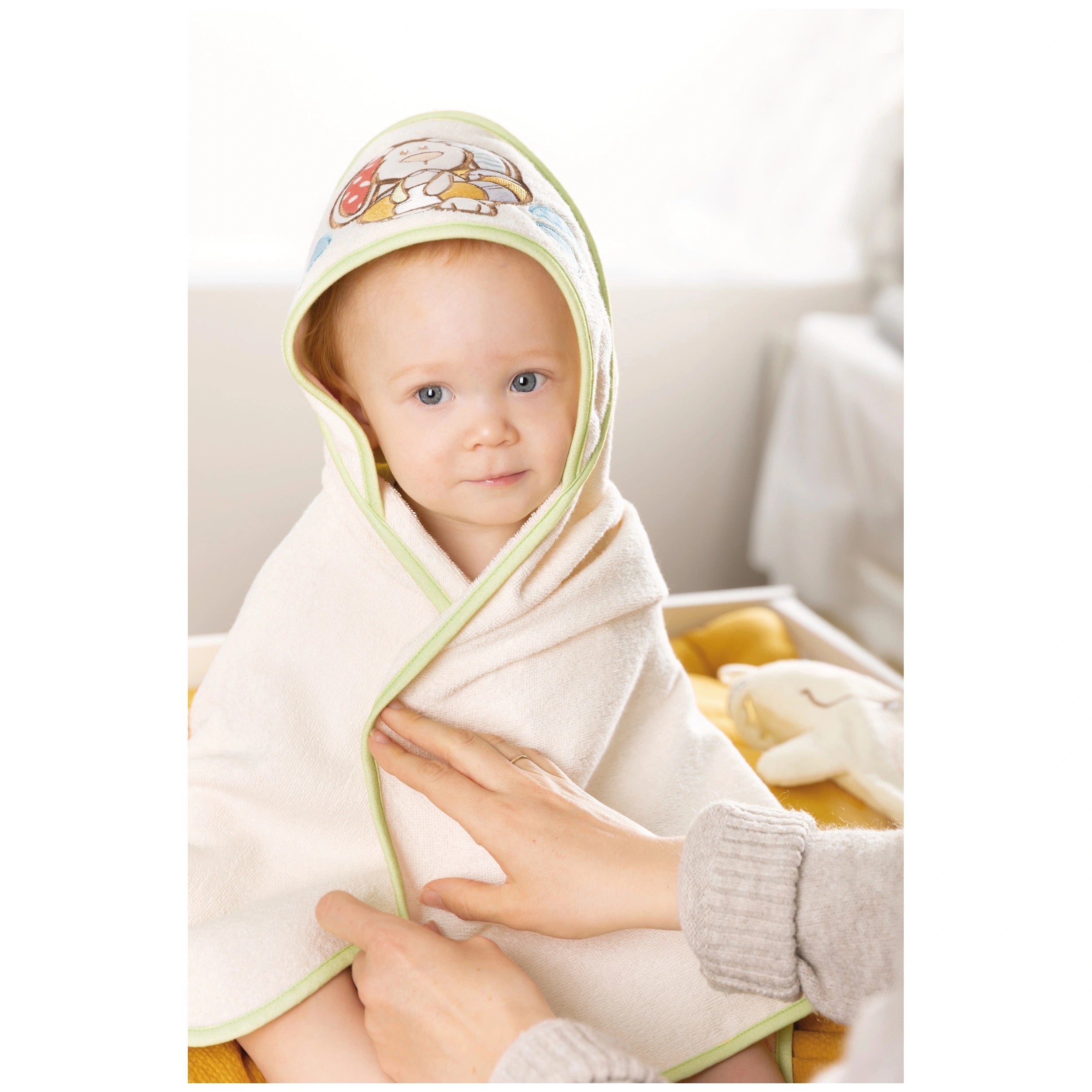 Crafted from plush terry cotton, the My First NICI hooded bath towel is exceptionally soft against your baby's delicate skin. Measuring 28 cm, it features a practical hood adorned with a cute rabbit Tilli appliqué, making it perfect for wrapping up your baby after a soothing bath. The towel's fluffy texture is not only perfect for drying off but also serves as a comfortable carpet pad for playtime, ensuring that your little one stays cozy and warm.