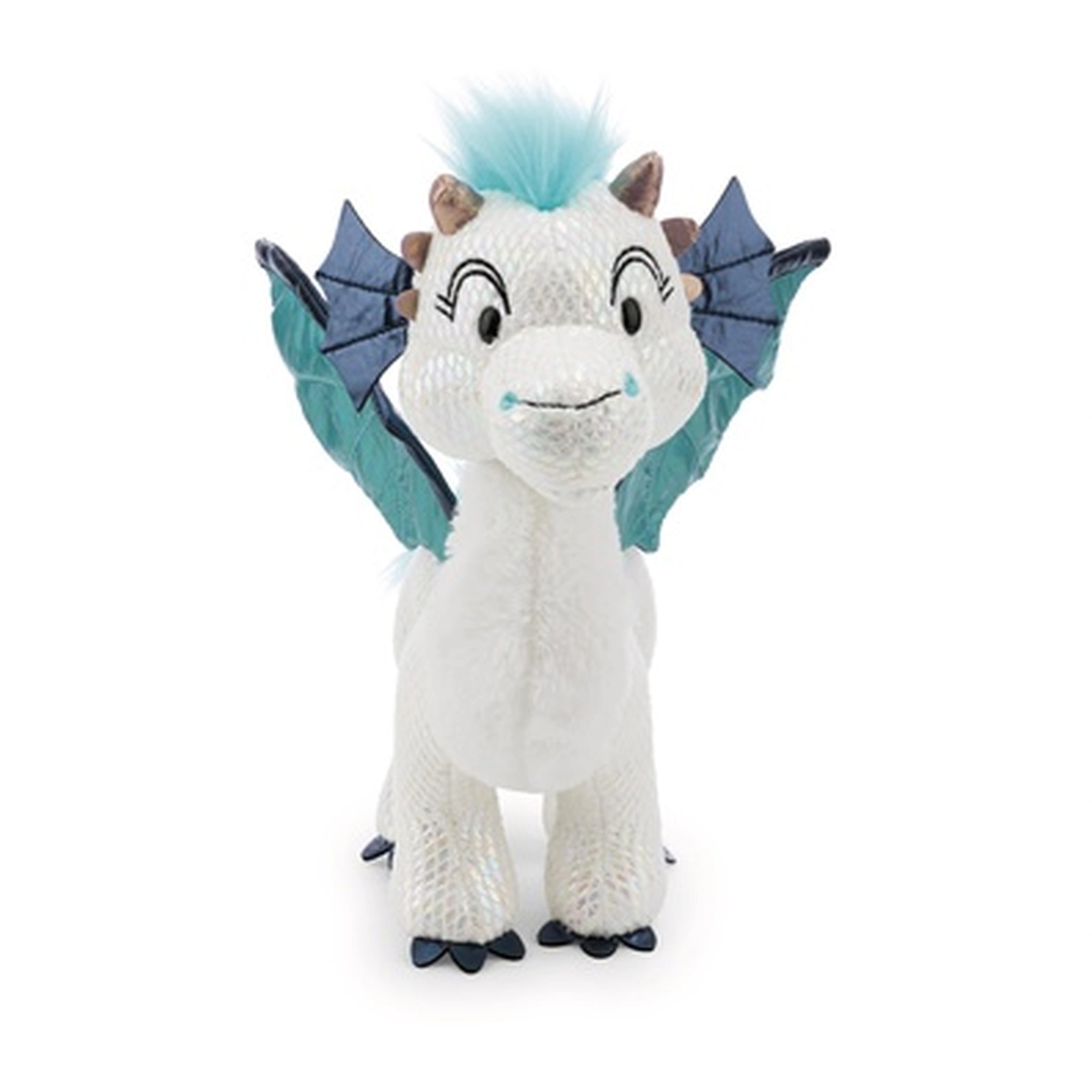 Introducing the NICI Drache Zafura, a stunning standing plush dragon measuring 27 cm, designed to captivate the hearts of both children and adults alike. This enchanting creature is part of the Wild Winter Collection by NICI, showcasing a unique pearlescent shimmer that catches the light beautifully, reminiscent of a precious crystal. Zafura's soft, snow-white plush fabric sparkles and glimmers, creating a magical presence that brightens any room and ignites the imagination.
