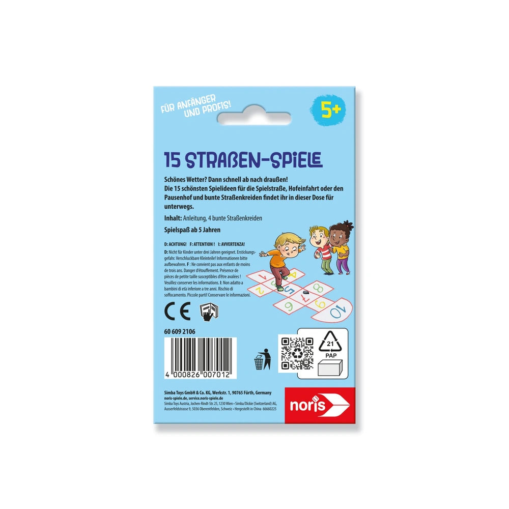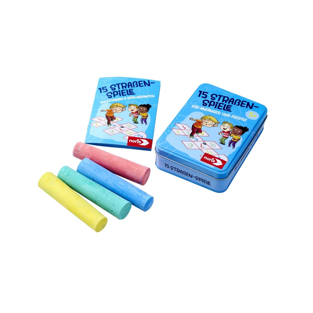Il set Noris 15 Street Games è perfetto per trasformare i marciapiedi grigi in zone avventura colorate. Include quattro gessetti colorati per marciapiede, permettendo ai bambini di creare ampi tabelloni di gioco direttamente a terra. Questa coinvolgente collezione di giochi di destrezza promuove il movimento e la scoperta all'aperto, rendendola un compagno ideale per vialetti, marciapiedi o cortili scolastici. Ogni gioco incoraggia i bambini a saltare, correre e lanciare, favorendo l'interazione sociale e l'attività fisica.