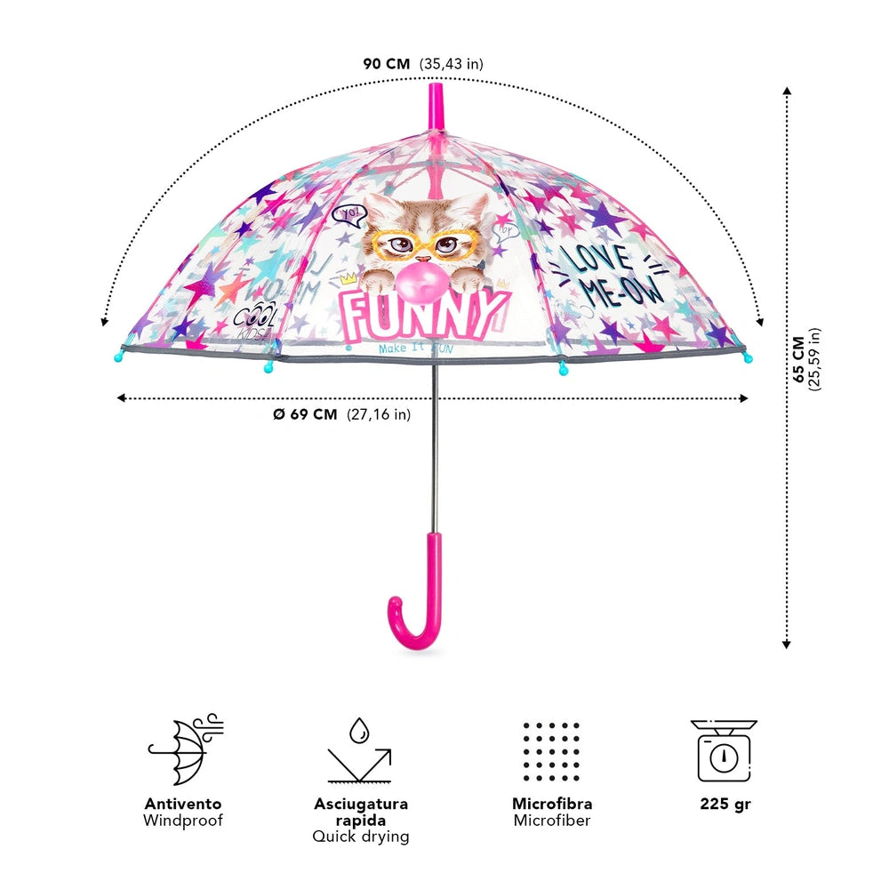 L'ombrello Perletti Cool Kids Funny Cat è progettato con un focus sulla sicurezza e sull'usabilità. La sua cupola "bubble" trasparente consente una visibilità totale, permettendo ai bambini di vedere l'ambiente circostante mentre rimangono protetti dalla pioggia. I bordi riflettenti aumentano la sicurezza assicurando che la tua bambina sia visibile agli altri, specialmente in condizioni di scarsa illuminazione. Questo ombrello è perfetto per l'uso quotidiano, sia che si tratti di una passeggiata verso la scuola o di una giornata divertente sotto la pioggia.