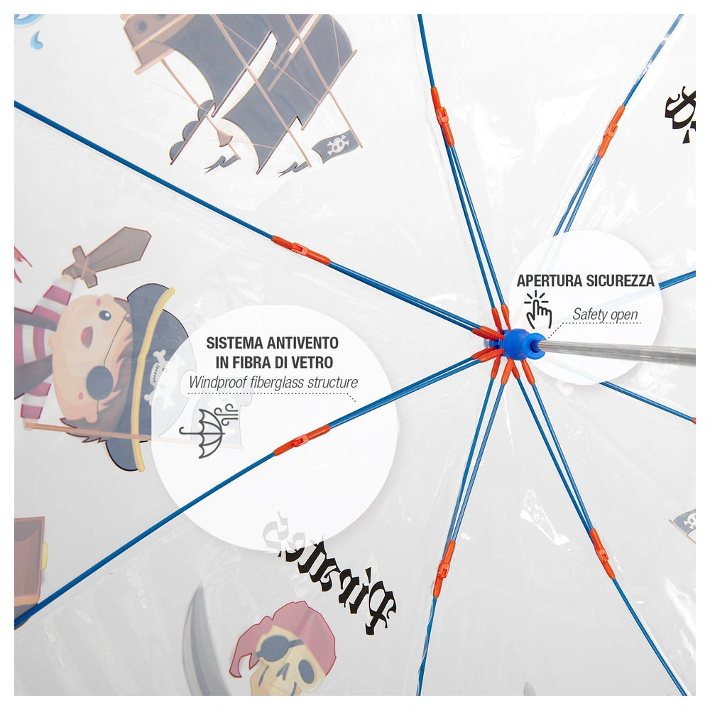 Perletti presenta un delizioso accessorio per la pioggia progettato per i giovani avventurieri. L'ombrello Cool Kids Pirata è un ombrello a cupola trasparente pensato per ragazzi dai 3 ai 5 anni. Questo prodotto trasforma le giornate di pioggia in emozionanti esplorazioni, dando priorità alla sicurezza e alla visibilità.