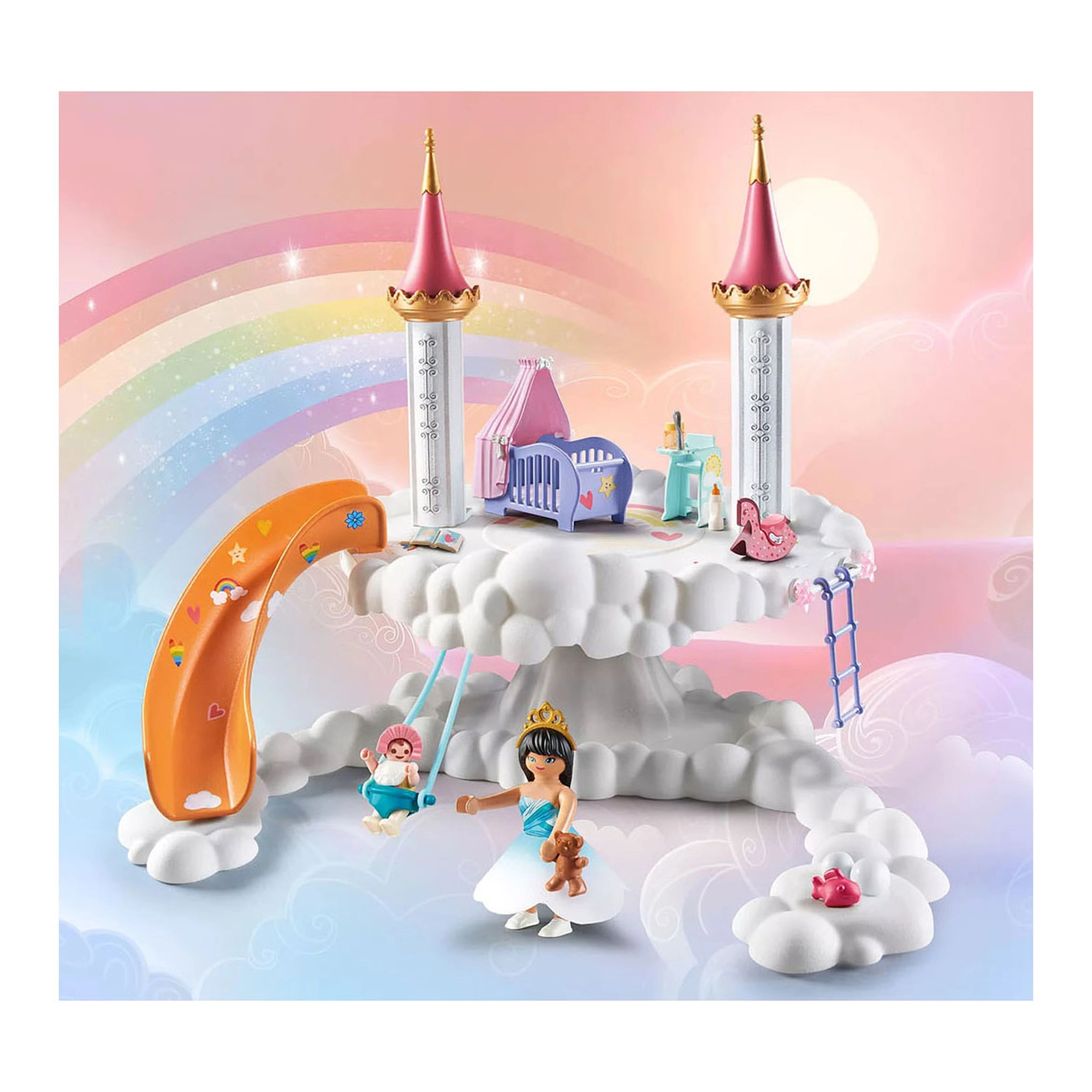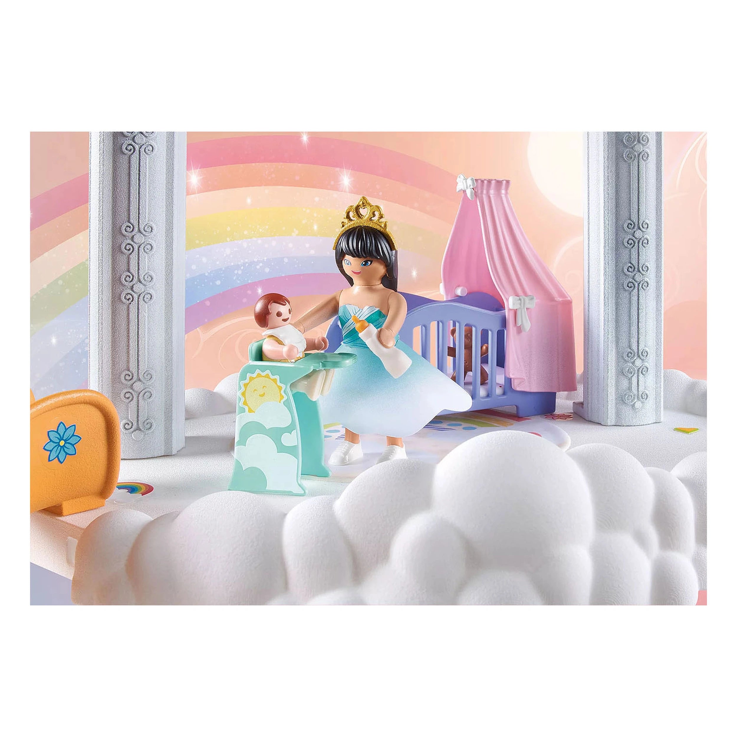 The Baby Room in the Clouds features a beautifully crafted environment where the rainbow princess lovingly attends to her newborn. Children can engage in various activities that mimic real-life parenting, such as cuddling, playing, and bathing the baby. The sliding feature adds an element of fun, allowing the princess and her baby to glide down from their cloud perch, making playtime both interactive and exciting. This playset encourages imaginative role-playing, helping children develop empathy and social skills as they care for their tiny royal.