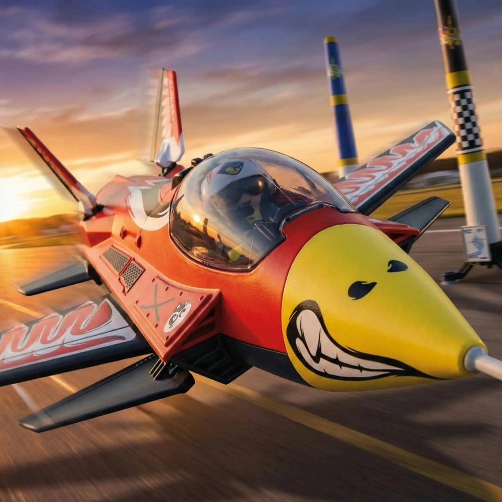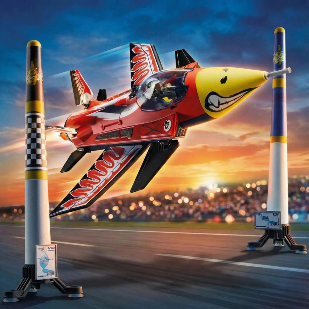 Packaging for Playmobil Stunt Show Air Jet Eagle toy playset, featuring the jet in vibrant colors against a blue sky backdrop, with a Playmobil pilot figure and large pylons included.
