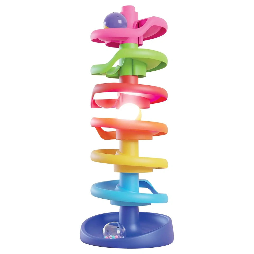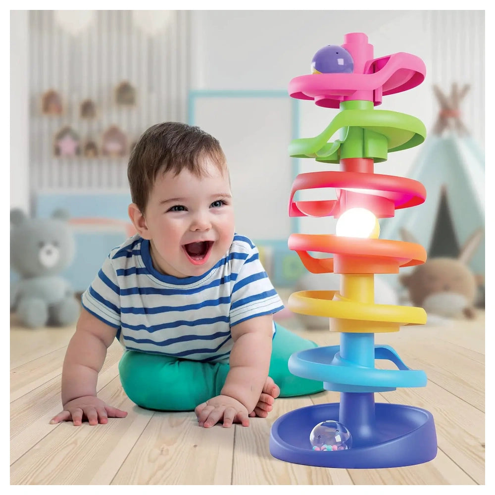 La Spiral Tower Brightball si erge a un'imponente altezza di 46 cm e presenta sette livelli facili da assemblare, creando un dinamico percorso a spirale per tre sfere specializzate. Ogni sfera è progettata per fornire un feedback sensoriale immediato: una palla luminosa attivata dal movimento che si illumina, una palla trasparente piena di coriandoli che fa rumore e una palla multicolore vivace. Questa combinazione non solo intrattiene, ma aiuta anche a sviluppare abilità essenziali come la coordinazione mano-occhio e la consapevolezza spaziale.
