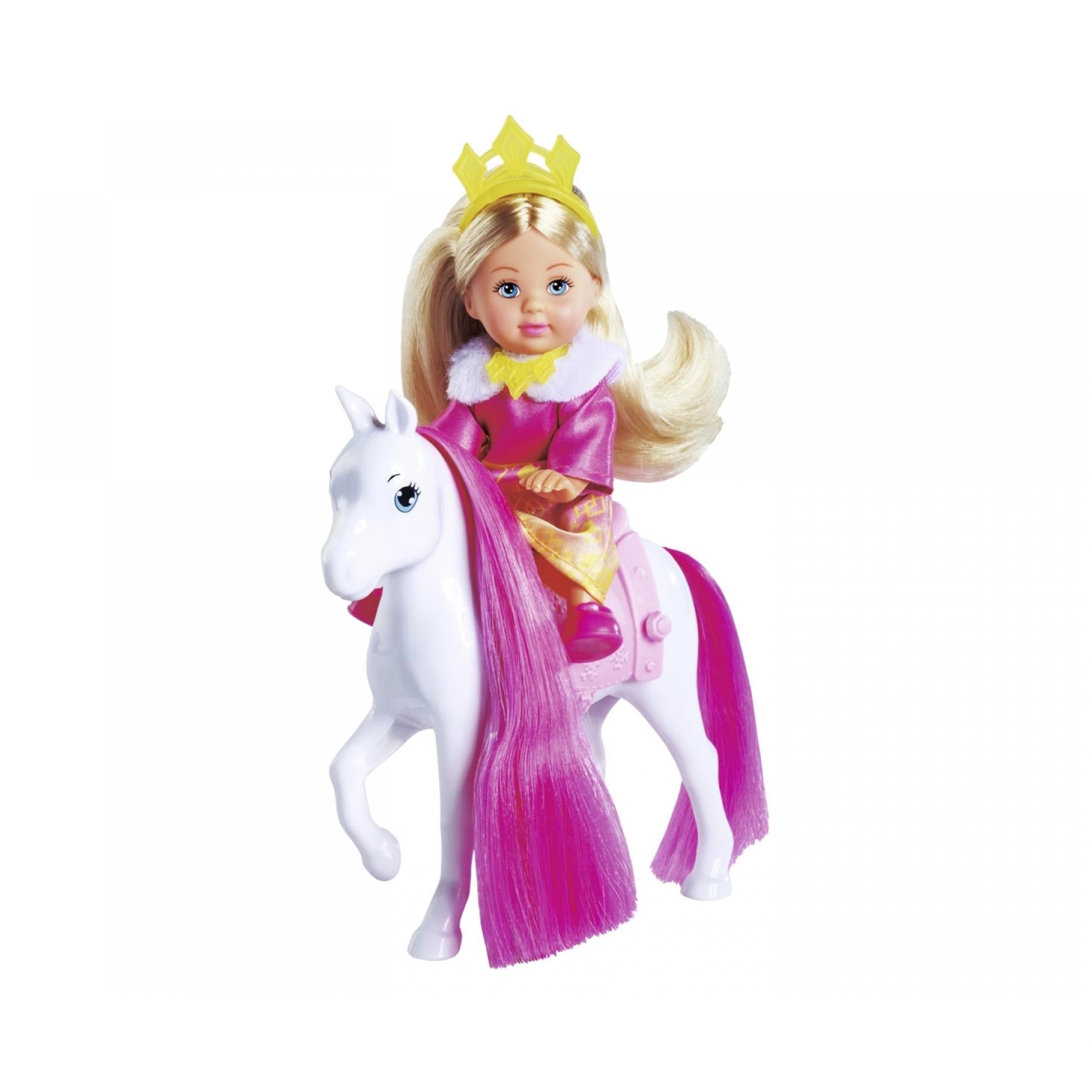 Evi herself is dressed in a breathtaking pink and yellow gown adorned with luxurious fur appliqués on the collar, showcasing her royal charm. This attention to detail in her outfit makes her not just a toy, but a character that children can connect with and admire. The combination of vibrant colors and intricate designs ensures that Evi stands out, making her a favorite among young princess enthusiasts.