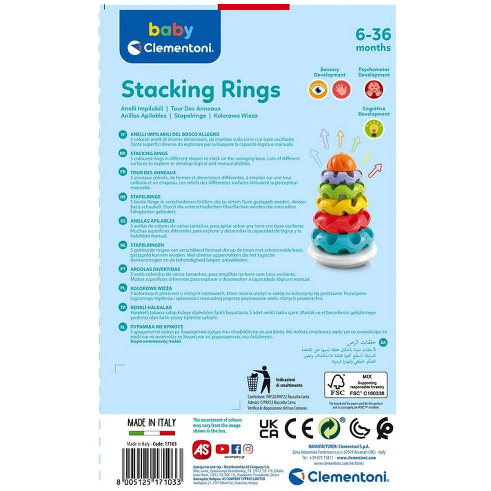 In conclusion, the Baby Clementoni - Stacking Rings Baby Activity Toys is an ideal choice for parents seeking a fun, educational, and safe toy for their infants. With its focus on sensory exploration, motor skill development, and cognitive growth, this toy is a must-have for any playroom. Don’t miss the opportunity to enrich your child’s playtime experience—order the Baby Clementoni Stacking Rings today and watch as your little one learns and grows through play!