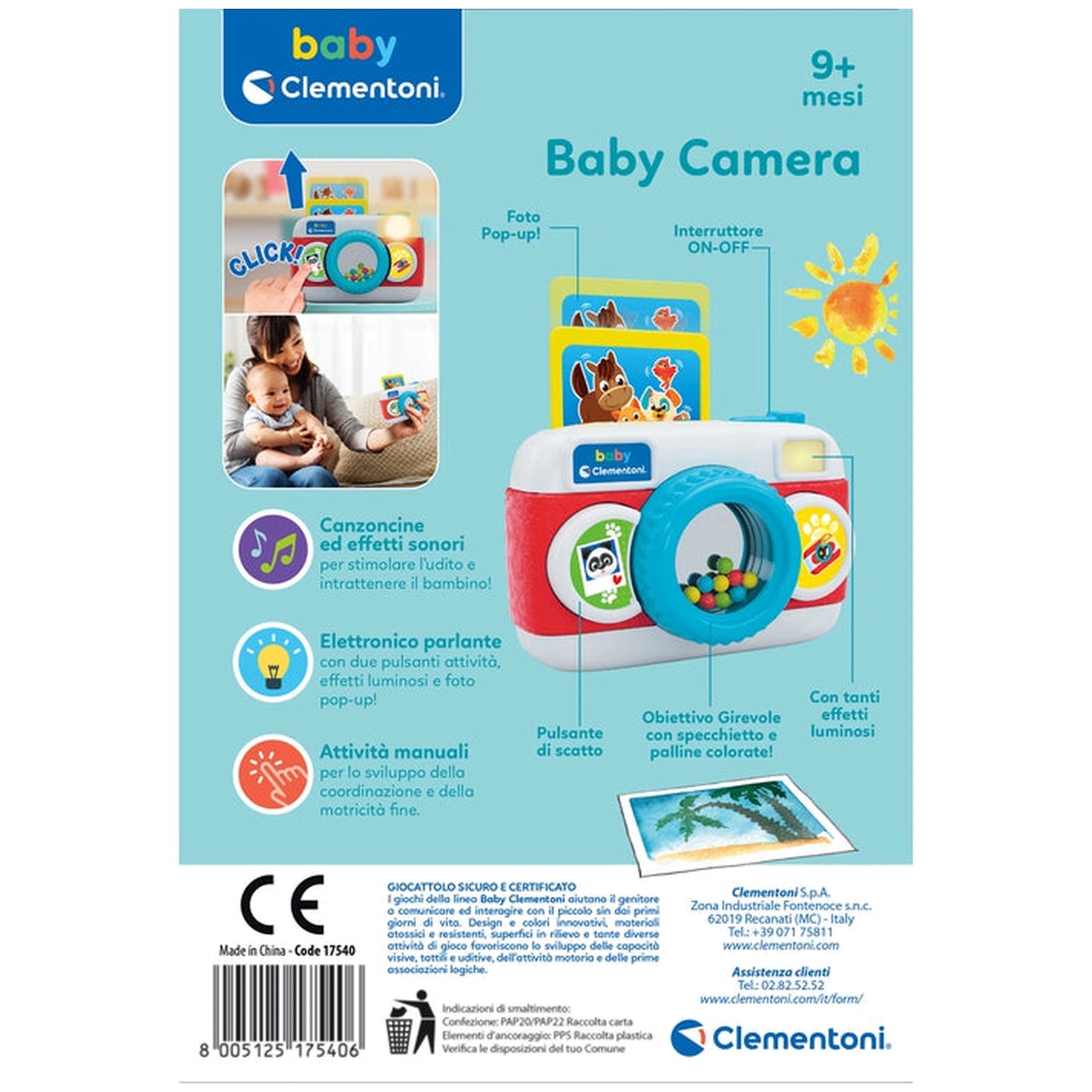 Introducing the Clementoni Baby Camera, an engaging and colorful baby activity toy designed to captivate your little one's imagination. This thoughtfully crafted camera not only serves as a delightful plaything but also introduces your child to a world of sounds, music, and interactive experiences. With its vibrant design and attention to detail, the Clementoni Baby Camera is perfect for children aged 9 months and older, making it an ideal gift for curious toddlers eager to explore their surroundings.