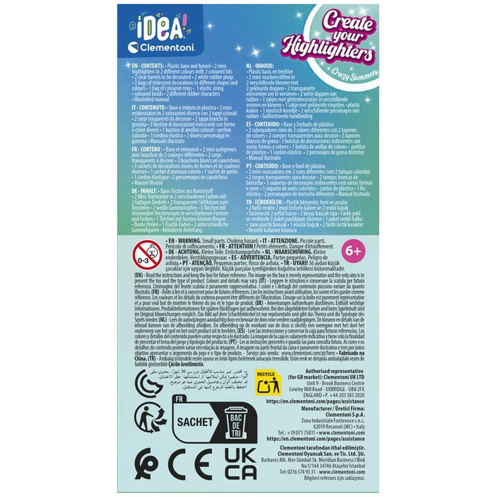 Designed and developed in Italy, the Clementoni - IDEA Create Your Highlighters kit reflects high-quality craftsmanship and attention to detail. The compact dimensions of the box (10 x 18.5 x 4 cm) make it easy to store and transport, ensuring that creativity can be taken on the go. Weighing just 145 grams, it is lightweight and perfect for travel, whether it’s a family trip or a playdate with friends.