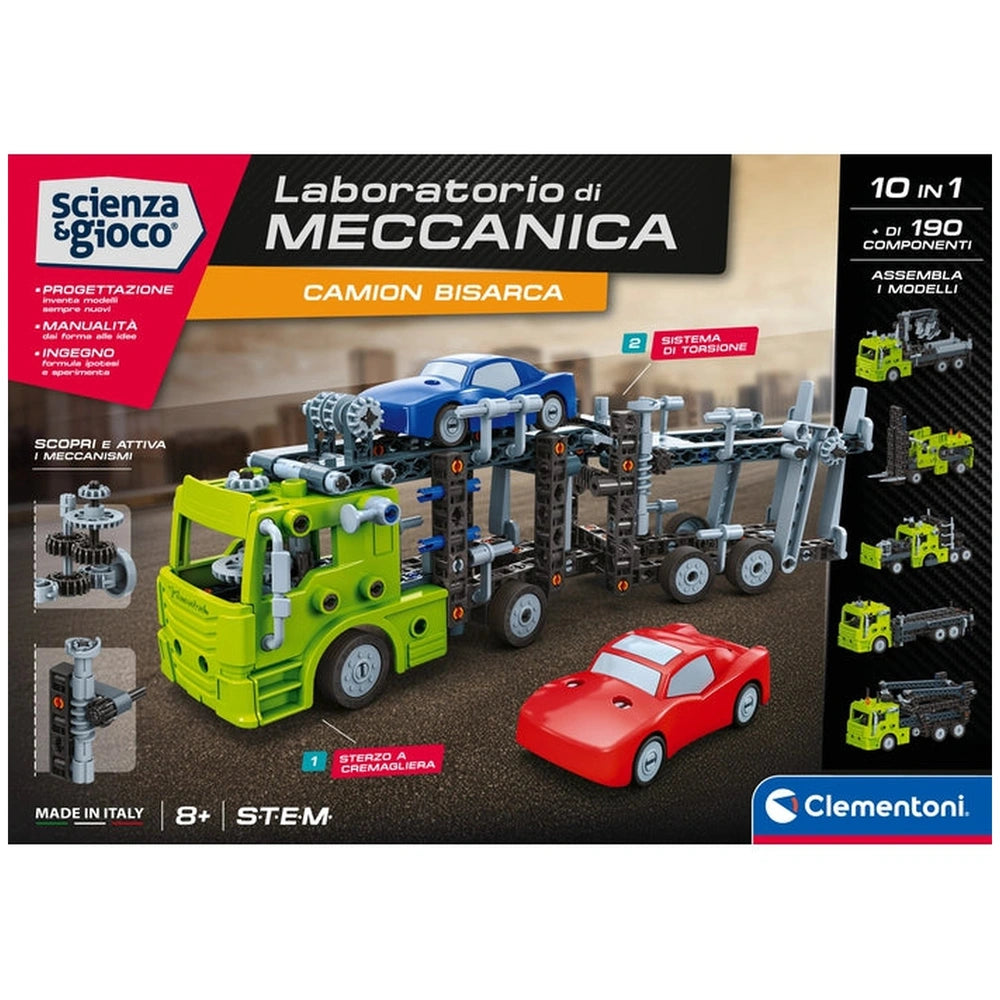 Introducing the Clementoni - Scienza & Gioco Laboratorio di Meccanica 10 in 1 Camion Bisarca STEM, an exceptional construction set designed to ignite the curiosity and creativity of young minds. This innovative multi-vehicle building kit allows children aged 8 and above to explore the fascinating world of mechanics through hands-on play. With its engaging design and educational value, this set is perfect for budding engineers and mechanics eager to learn while having fun.
