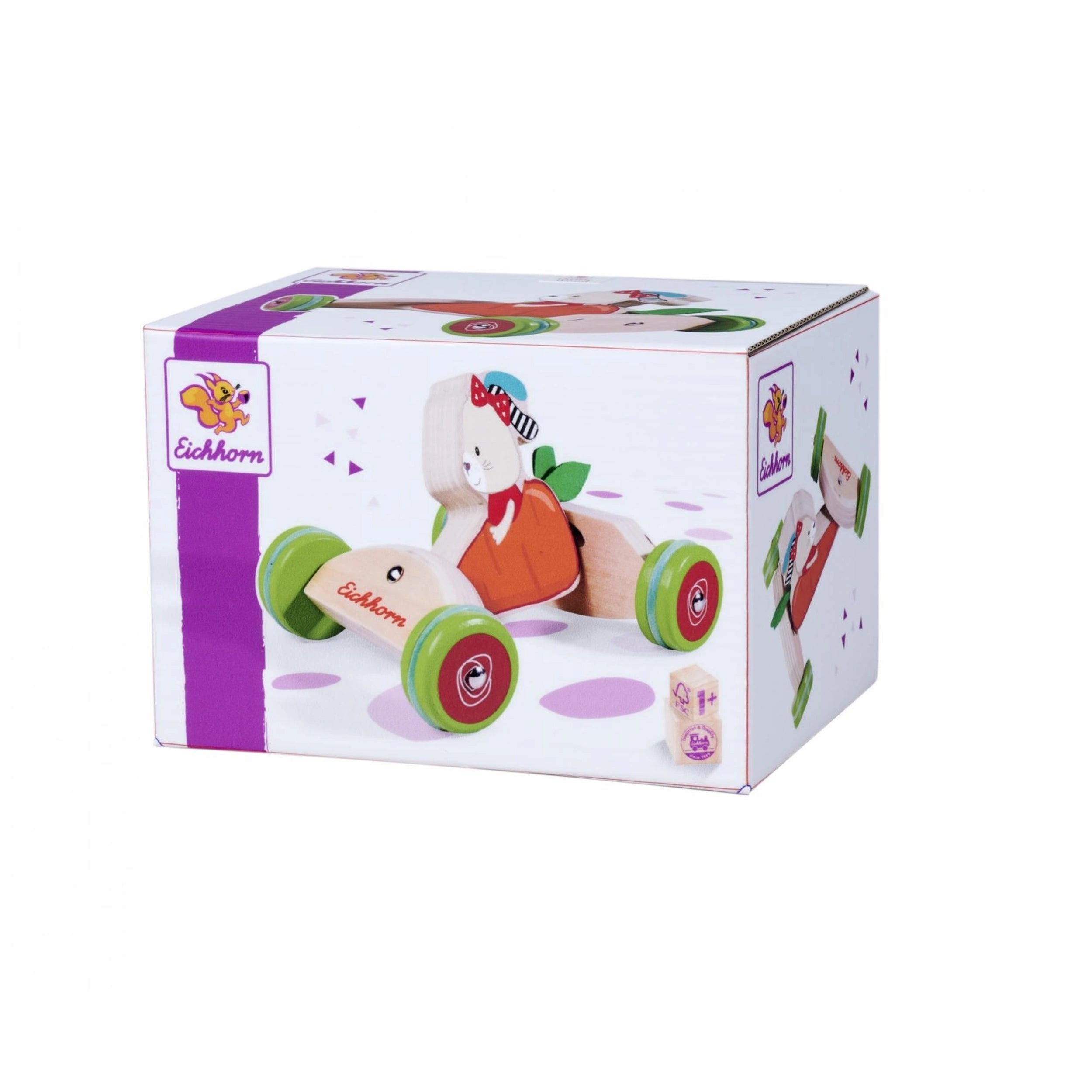 Measuring 16 cm in length, this push vehicle is perfectly sized for small hands, allowing toddlers to easily grasp and maneuver it. The bunny, nestled comfortably in its carrot cockpit, adds a whimsical touch that captures the attention of both boys and girls. The thoughtful design ensures that the toy is not only visually appealing but also safe and durable, meeting the highest standards of quality that Eichhorn is known for.