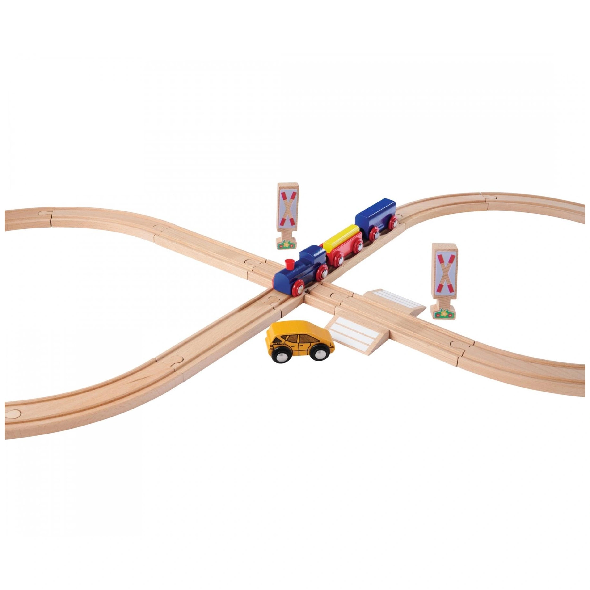 Introducing the Eichhorn Train Track 8 Figure Playset, a captivating toy designed to ignite the imagination of young train enthusiasts. This meticulously crafted playset features a total of 27 pieces, including tracks, signs, a crossing, trees, a car, and a charming train with two wagons. With a generous track length of 290 cm, children can create their own thrilling roller coaster adventures, making it an ideal addition to any playroom or educational setting.