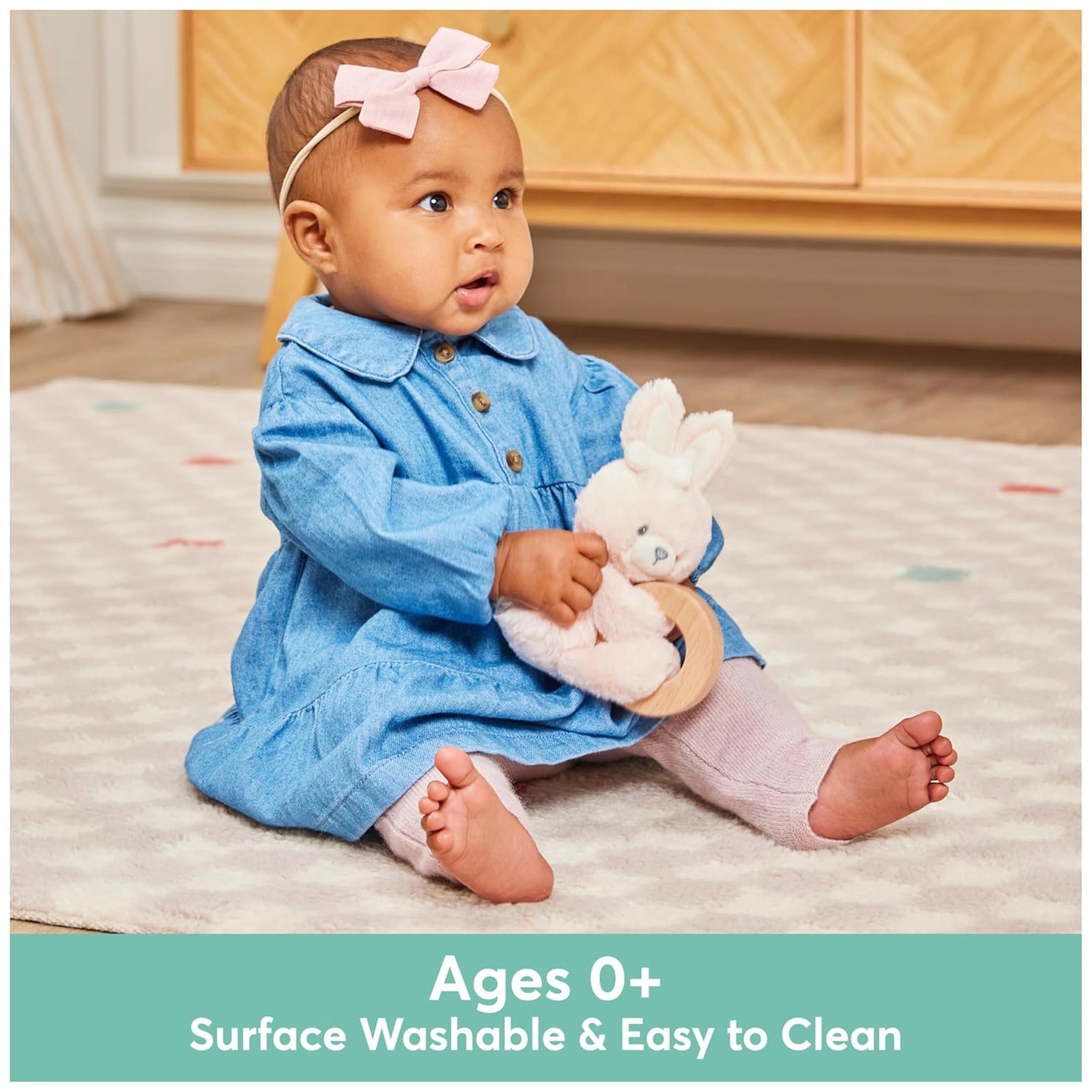 Introducing the Gund Soft Animal Ring Rattle, a delightful addition to your baby's playtime essentials. This charming rattle features a beautifully crafted 5-inch pink rabbit that produces a gentle sound when shaken, designed to captivate your little one's attention and encourage movement. The soft plush rabbit is securely attached to a natural wood ring, making it not only a fun toy but also a timeless decoration that enhances any nursery. With its durable design, this rattle is sure to be a cherished companion for years to come.