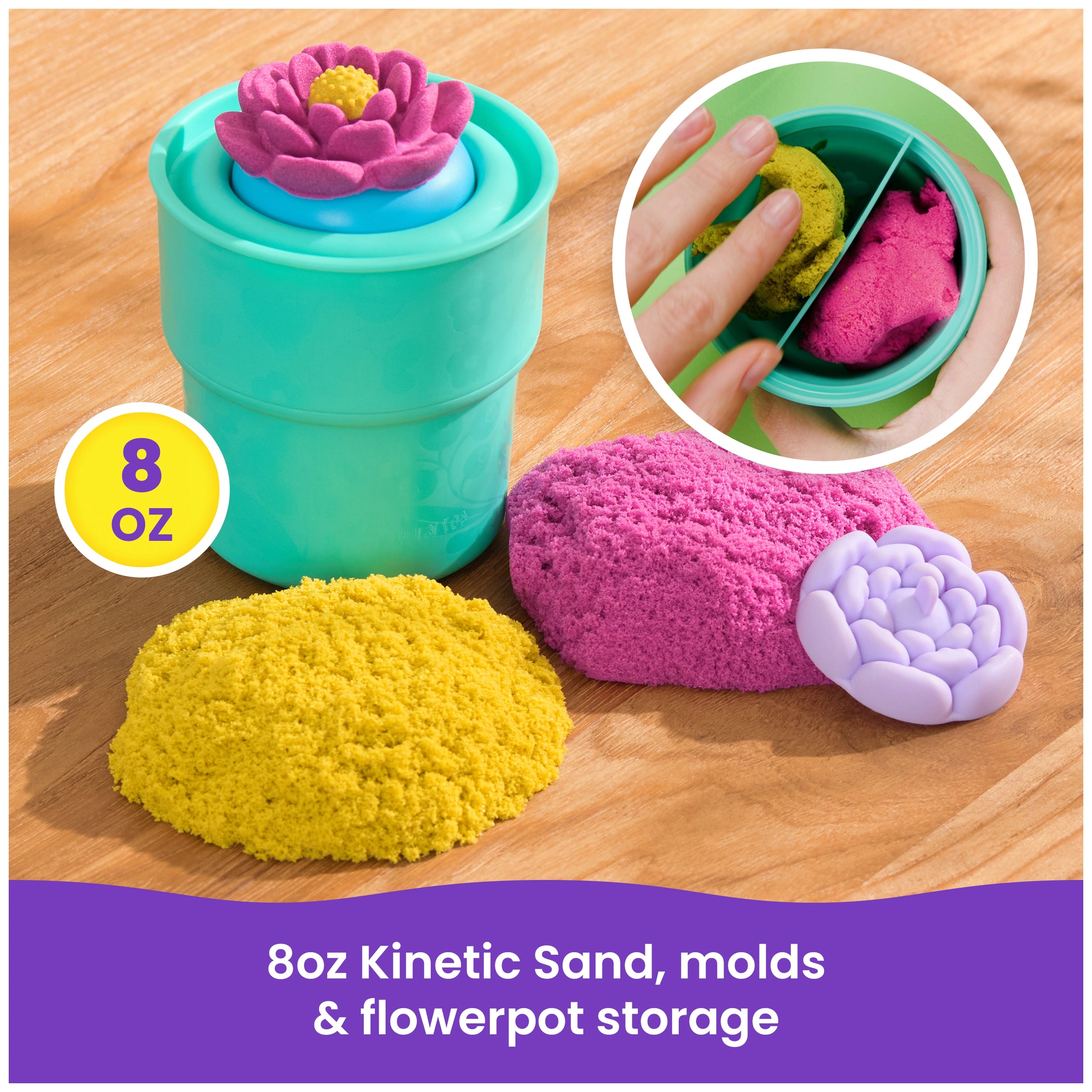 The Kinetic Sand Squish Blossom kit includes 8oz of neon pink and yellow Kinetic Sand, a flowerpot, and a flower mold, along with additional molds located at the bottom of the pot. Children can fill the flower mold with the colorful sand, press it down onto the foam, and watch in amazement as their flower magically blooms when lifted. This interactive process not only captivates young minds but also enhances their fine motor skills as they manipulate the sand and molds.