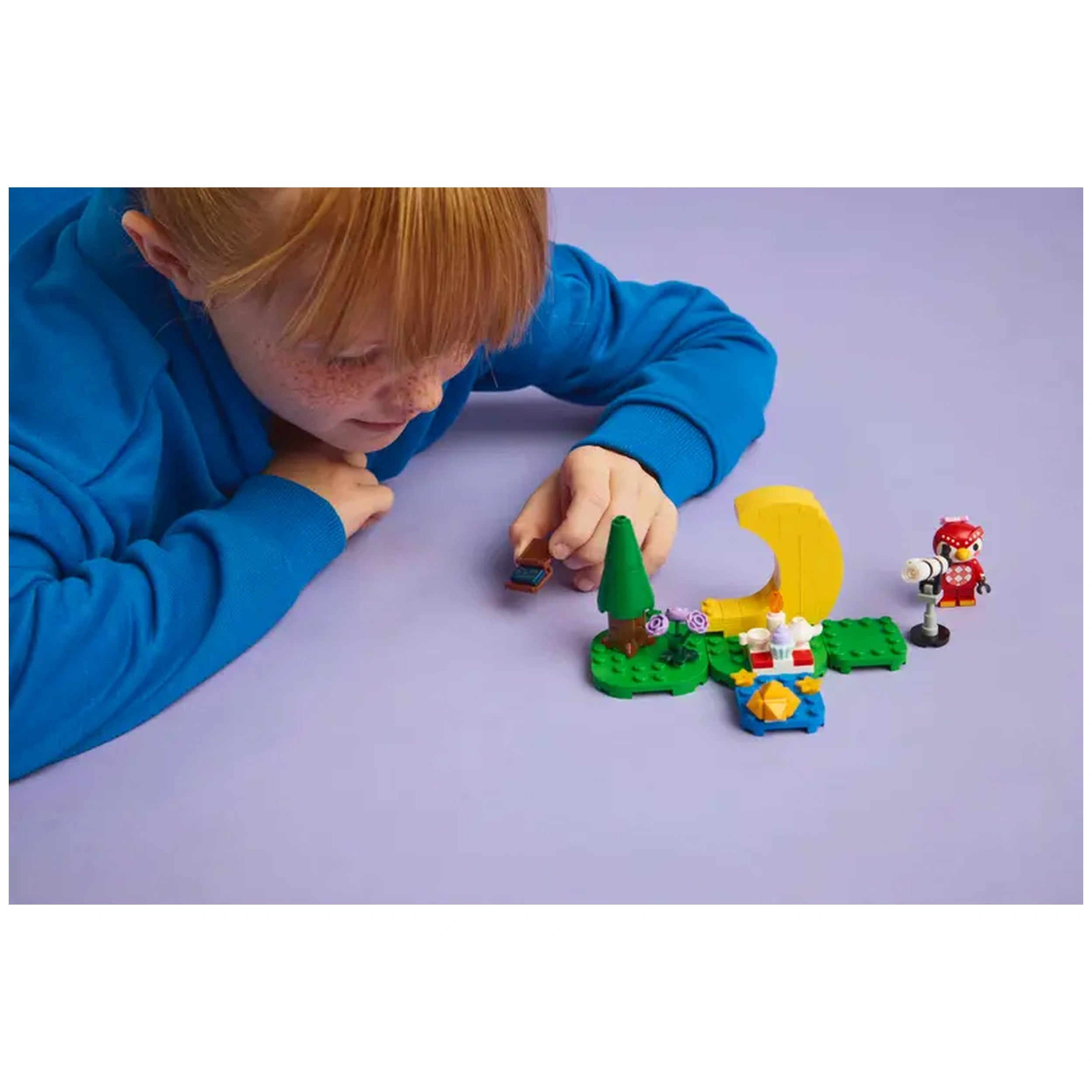 A young child in a blue sweatshirt leans over a colorful LEGO® set themed around Animal Crossing™, featuring a green base, a small tree, flowers, and characters, including a telescope and a crescent moon, on a light purple surface.