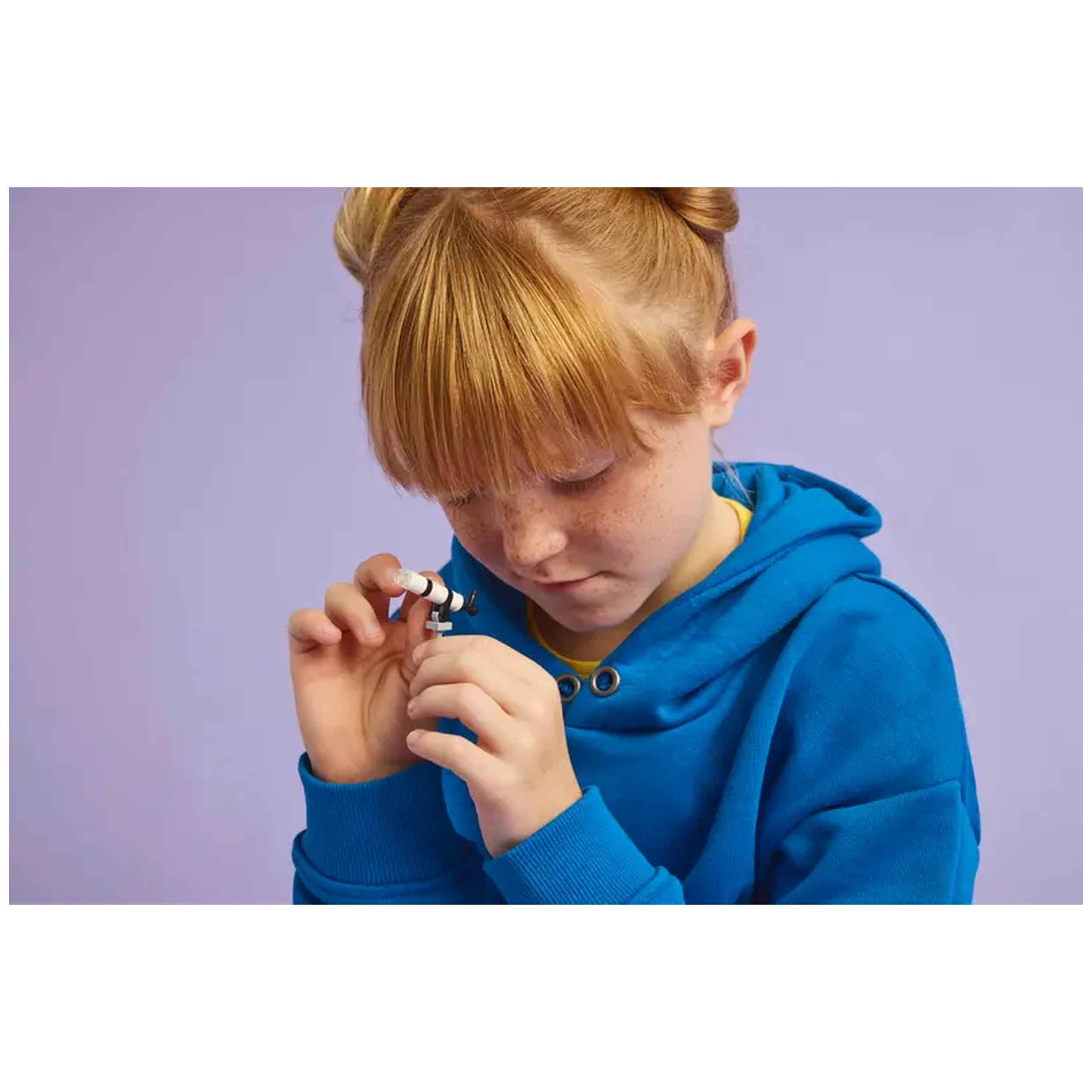 A child with red hair and freckles wearing a blue hoodie curiously holds a small toy telescope, focusing intently.