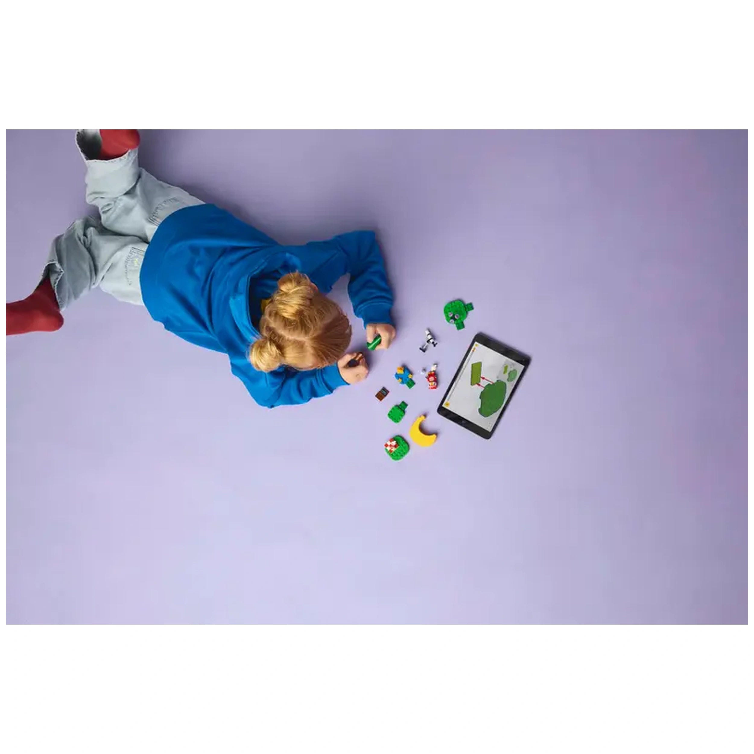 A child in a blue hoodie lies on a purple surface, focused on assembling colorful LEGO® pieces, with a tablet displaying a scene from Animal Crossing™ nearby.