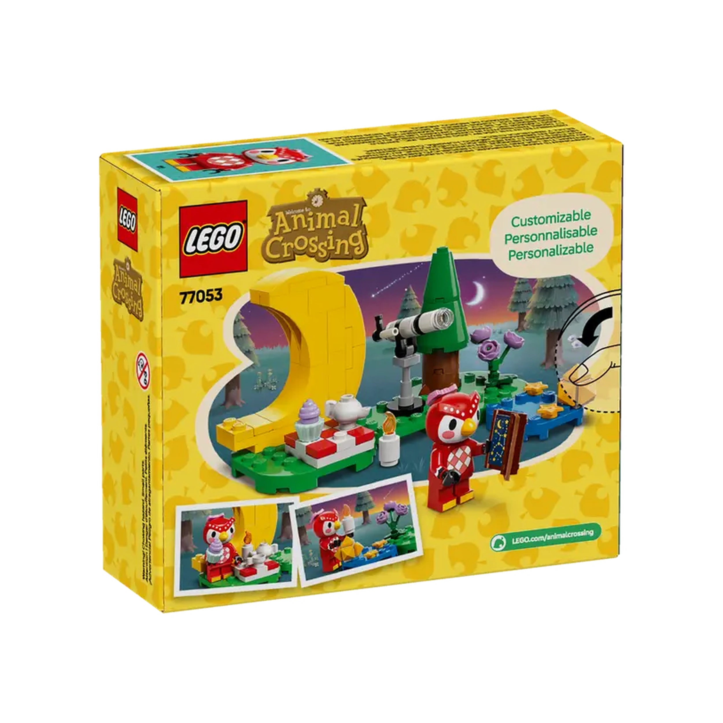 LEGO® Animal Crossing™ Stargazing with Celeste set featuring a telescopic toy, a minifigure of Celeste the owl, and an outdoor scene with trees and flowers.