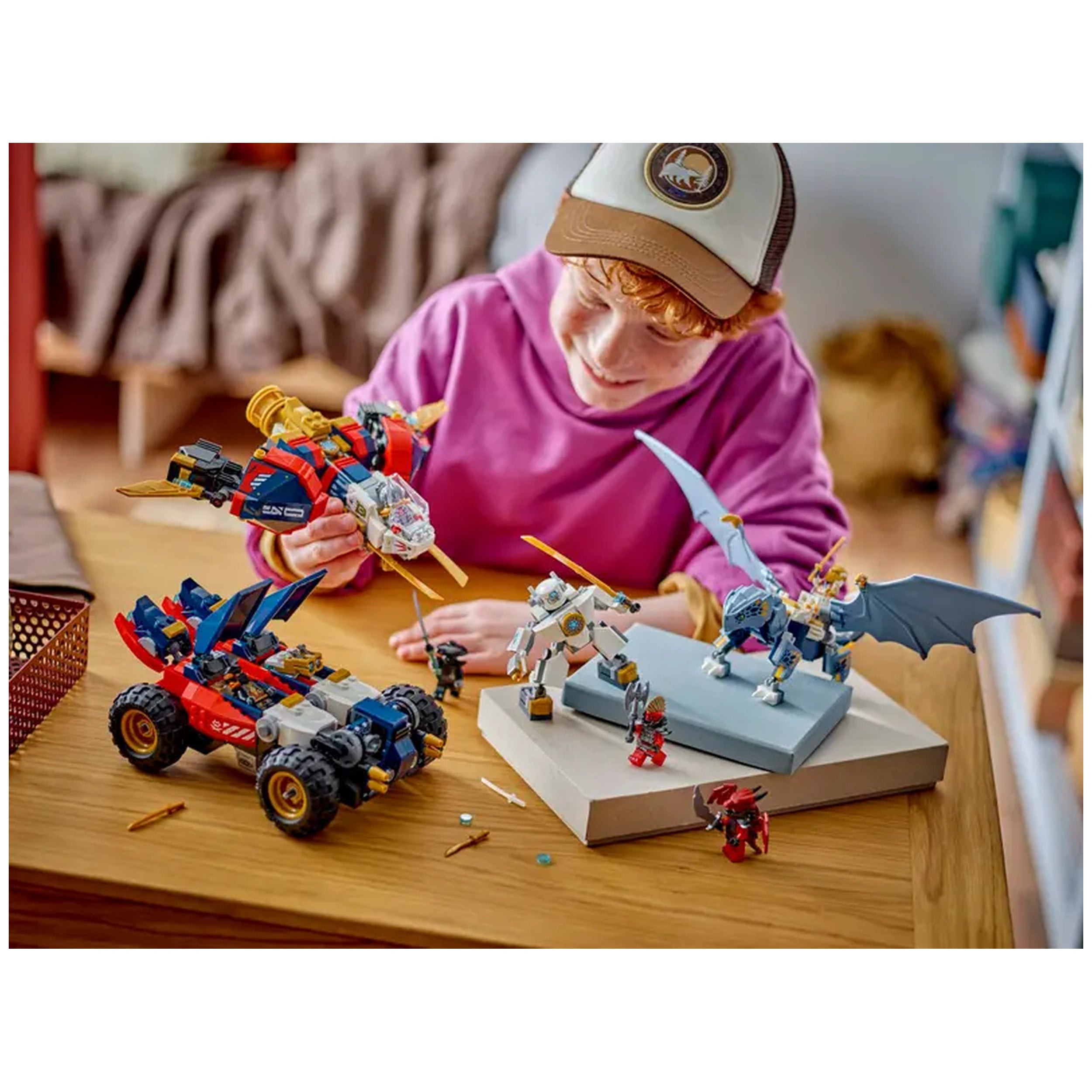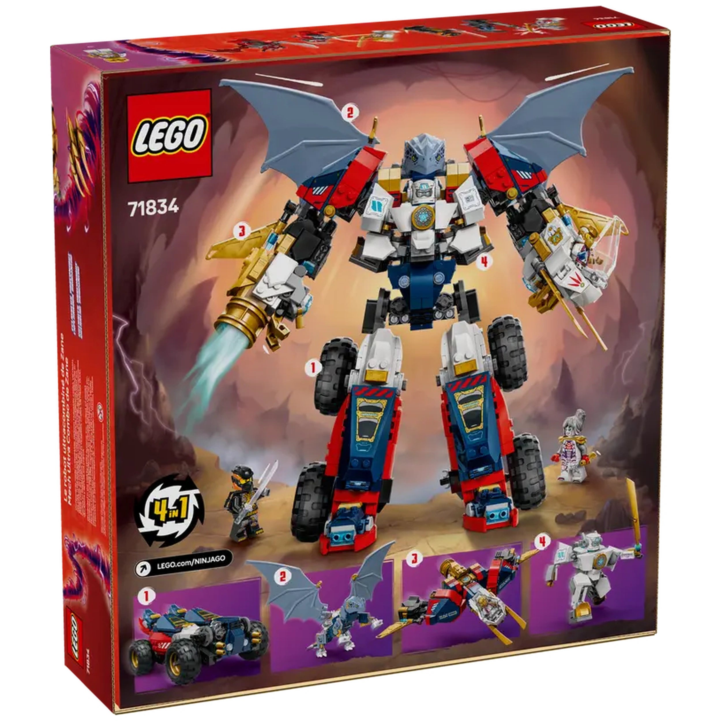 What sets Zane's Ultra Combiner Mech apart is its versatility. The mech can be transformed into four smaller models, including a dragon toy with posable features and wings, a jet toy with movable engines and a rotatable cockpit, and a car toy with four large off-road wheels and two opening cockpits—one of which conceals hidden blasters. This transformation capability not only adds to the play value but also encourages kids to explore different scenarios and adventures.