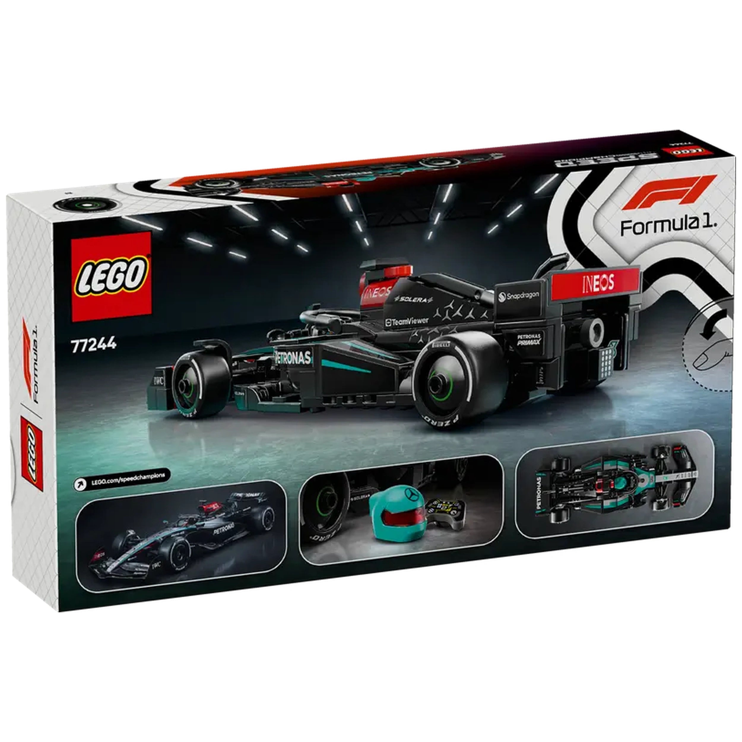 The LEGO® Speed Champions Mercedes-AMG PETRONAS F1® Team Race Car features intricate design elements that mirror the real-life racing vehicle. From the cockpit that opens by lifting the halo bar to the meticulously crafted rear wing and wishbone suspension, every detail has been thoughtfully designed to provide an authentic building experience. The model also includes sponsor stickers and wider rear tires imprinted with “Pirelli,” ensuring that it captures the essence of the high-speed world of Formula 1 racing.
