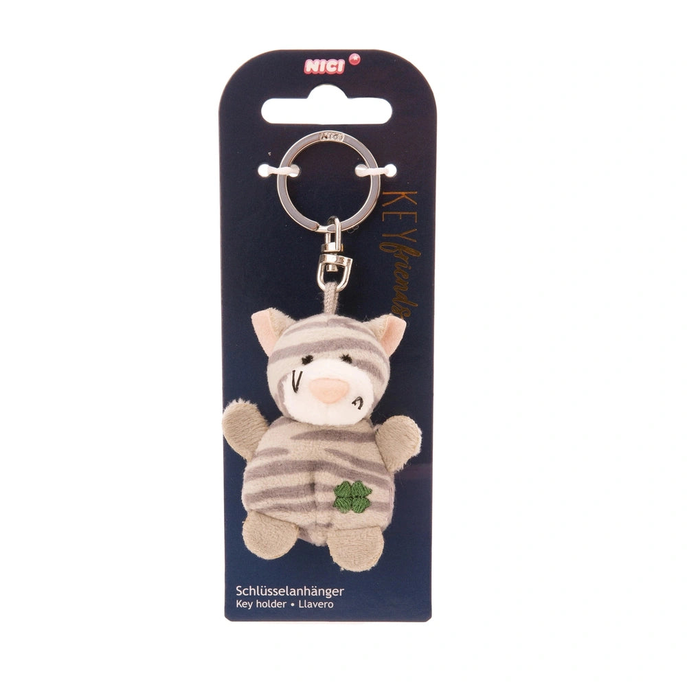 Introducing the NICI Key Friends - Keyholder Grey Striped Cat with Cloverleaf, a delightful accessory that brings a touch of whimsy to your everyday life. This charming keyholder is part of NICI's beloved Key Friends collection, designed to add a playful flair to your keys, bags, or backpacks. Crafted with care, this plush pendant features a sturdy metal key ring, ensuring that your keys are not only secure but also stylishly displayed.