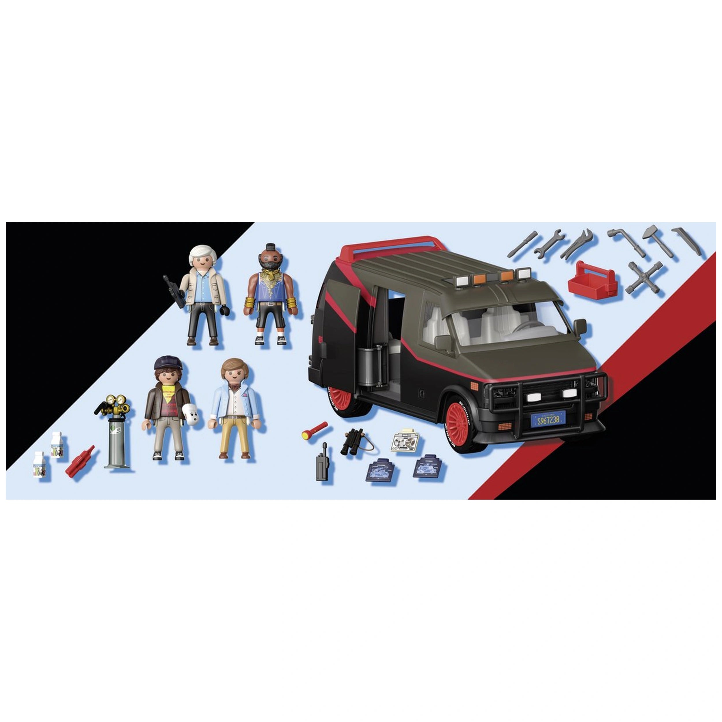 This set is not only a fantastic addition to any Playmobil collection but also a must-have for A-Team enthusiasts. The van boasts the iconic tri-color paint job, extended sun visor, and striking red rims, mirroring the original vehicle from the show. The attention to detail in the design makes it a standout piece that will surely be a conversation starter among fans of all ages.