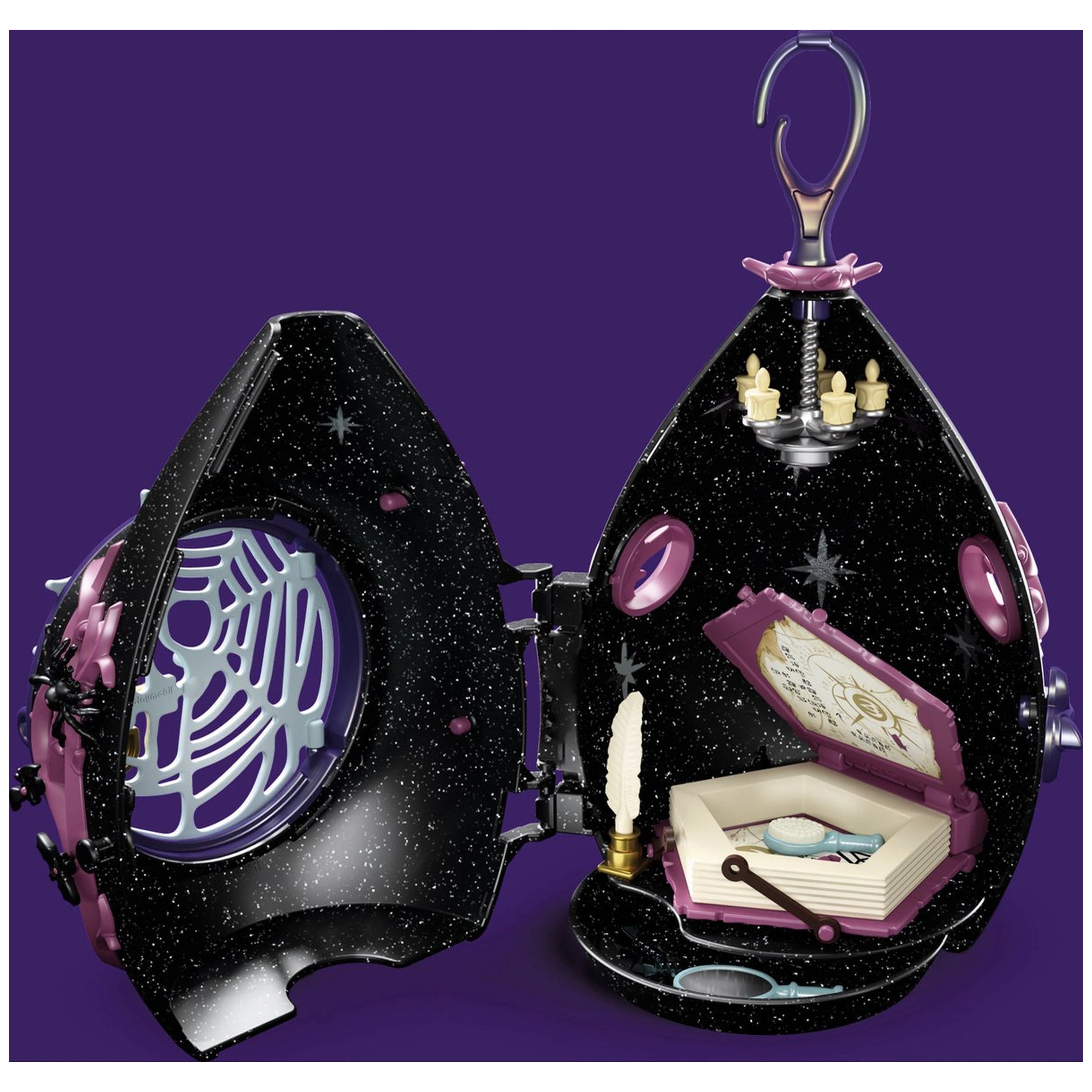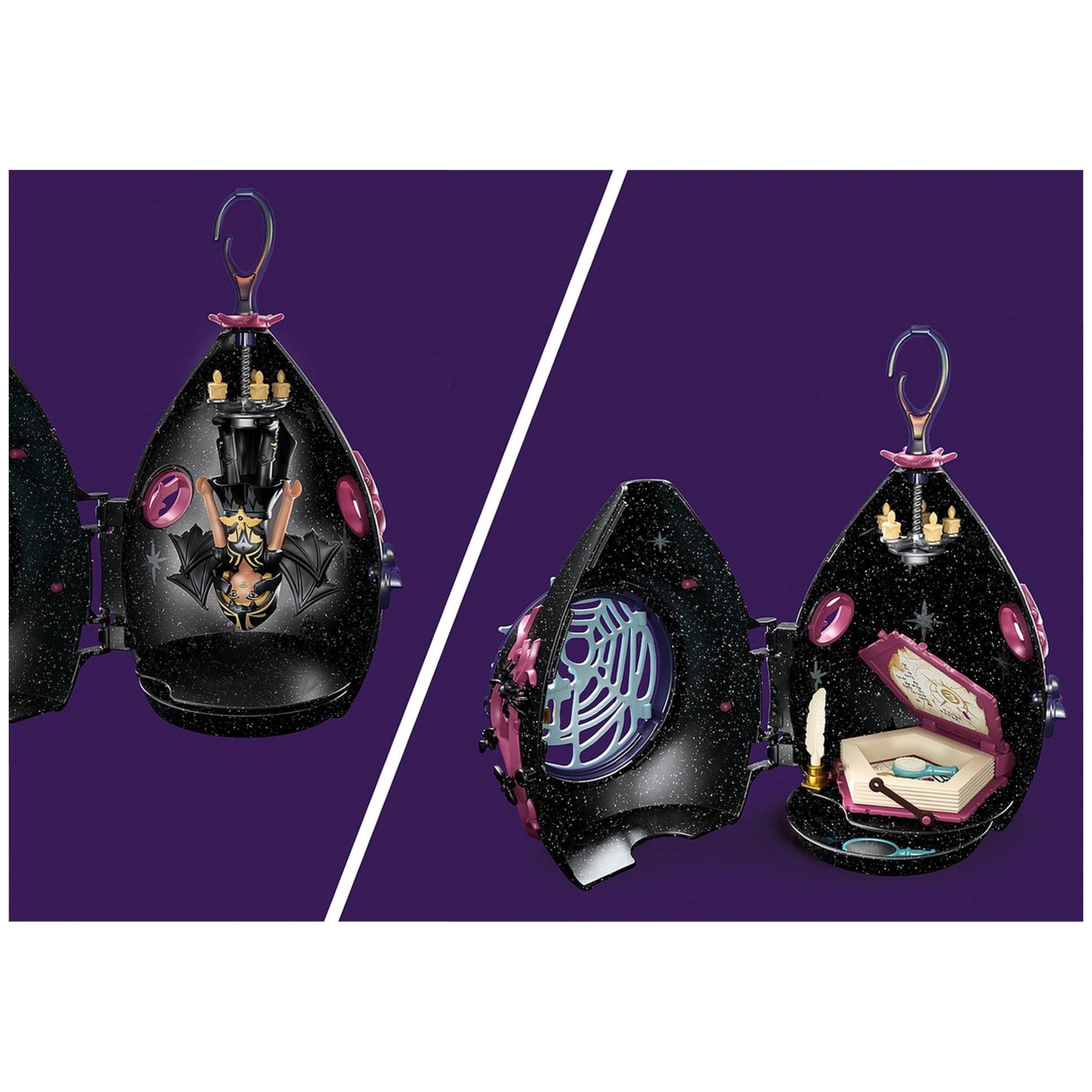 The Bat Fairy House features a unique droplet-shaped structure that adds an element of fantasy to any playtime scenario. Inside, children will find the Bat Fairy diligently studying her magical parchment, pondering where more crystals might be hidden. The set includes three sparkling crystals, a feather, an inkpot, a hairbrush, and a Bat Fairy cape, allowing kids to engage in a variety of magical adventures. The Bat Fairy's wings add a touch of elegance, making her a delightful character for storytelling.