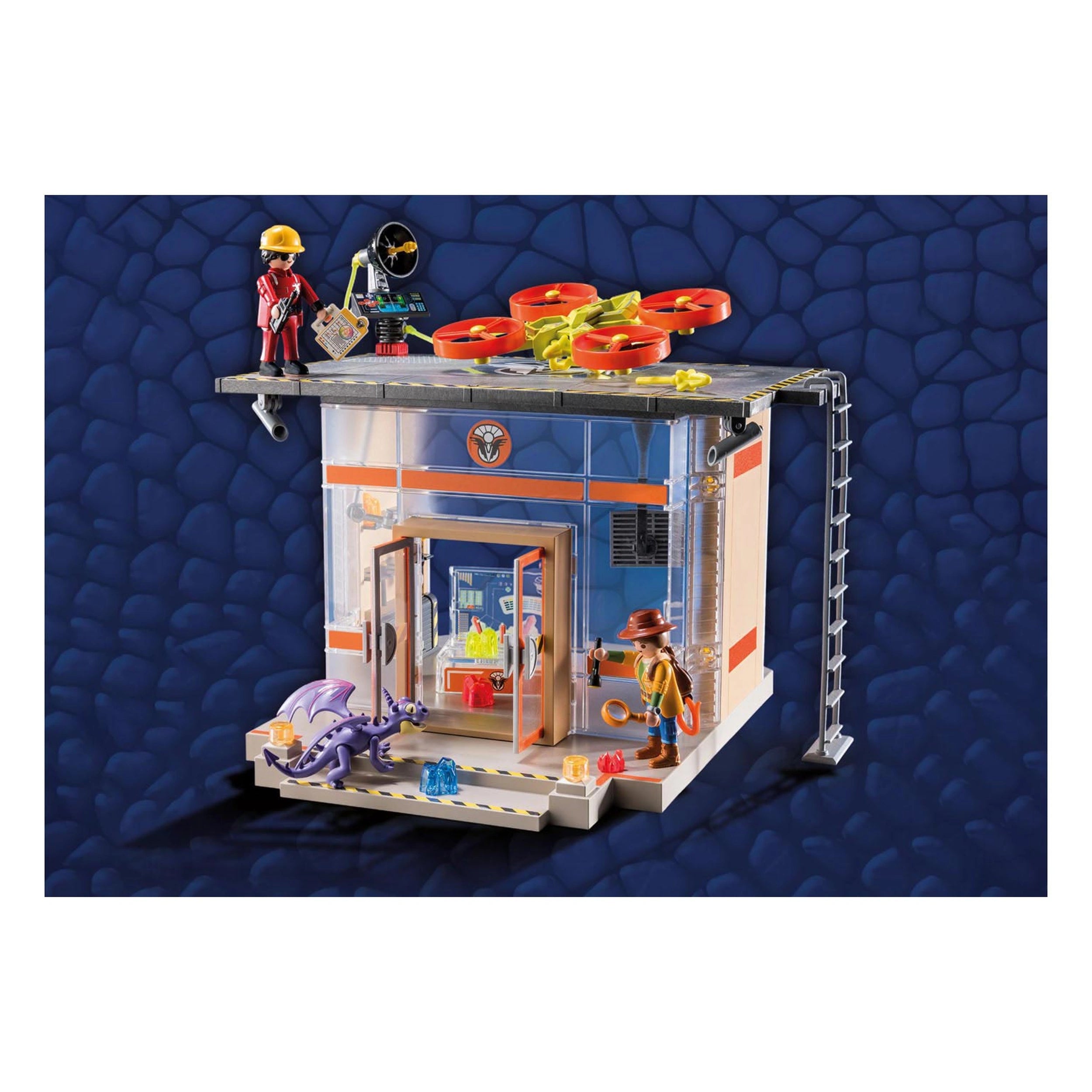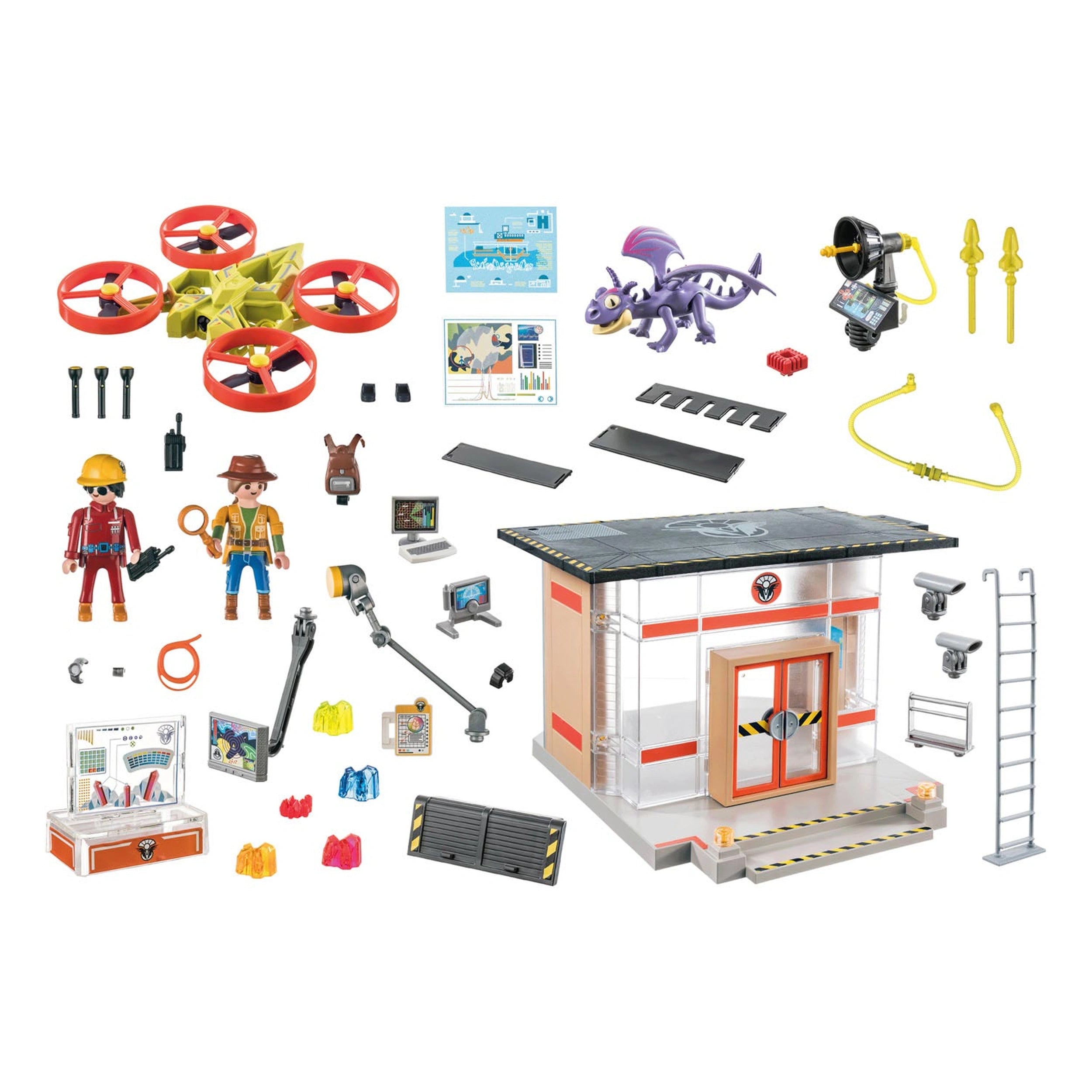 One of the standout features of this playset is the drone landing platform located on the roof of the lab. Children can take control of the large drone, which is equipped with movable rotors and a shooting function, adding an exciting dynamic to their play. The integrated foot clamp allows figures to ride along, making every mission feel like a thrilling adventure. This feature encourages role-playing and teamwork as kids navigate the skies in search of dragons.