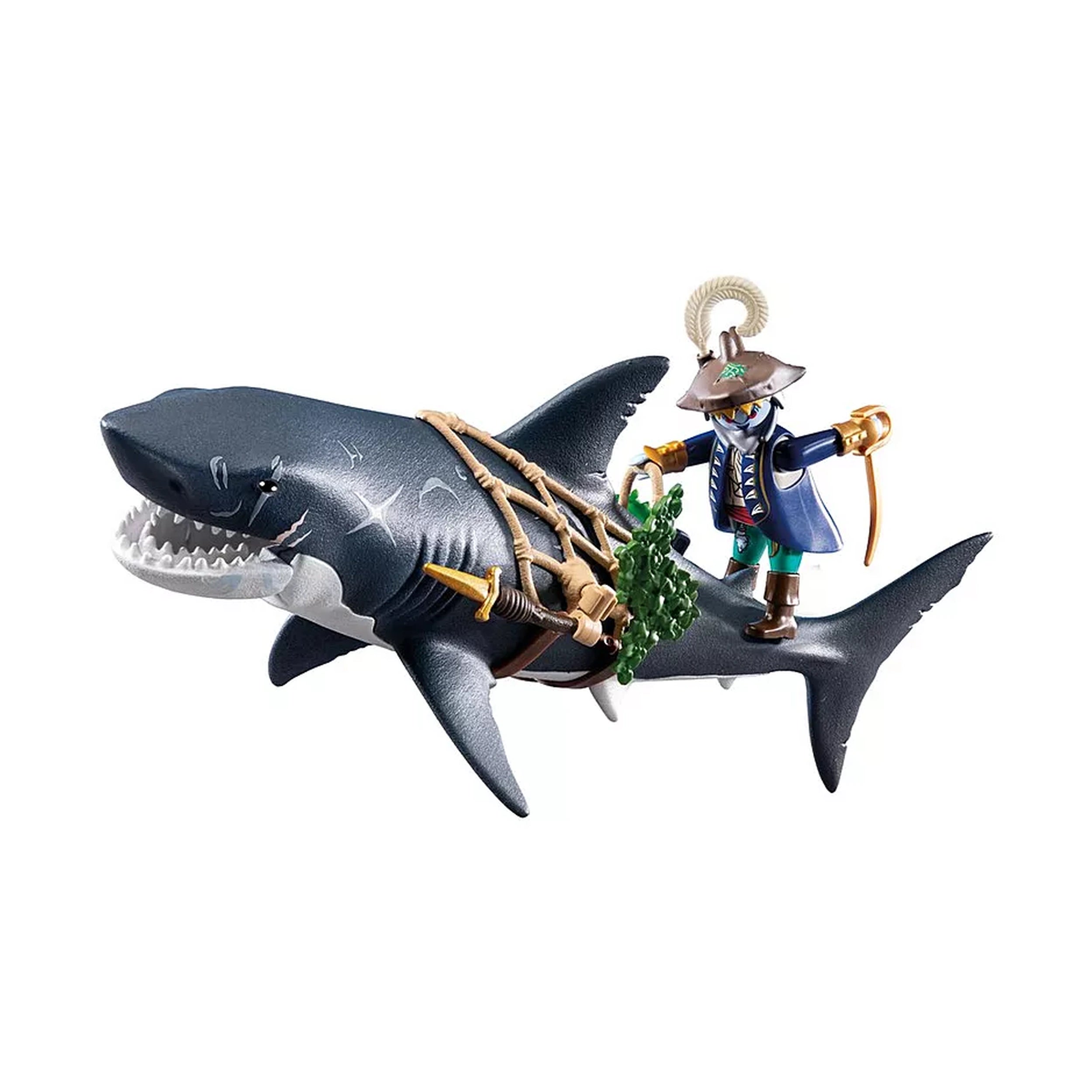 Accompanying the shark is a fierce pirate, equipped with a saber and a variety of accessories that enhance the adventure. The pirate clings to the shark's net, poised for action as he navigates the treacherous waters. With detachable weapons and accessories, children can customize their pirate's gear, fostering creativity and personal expression during playtime. The attention to detail in the figures and accessories ensures that every adventure feels authentic and engaging.