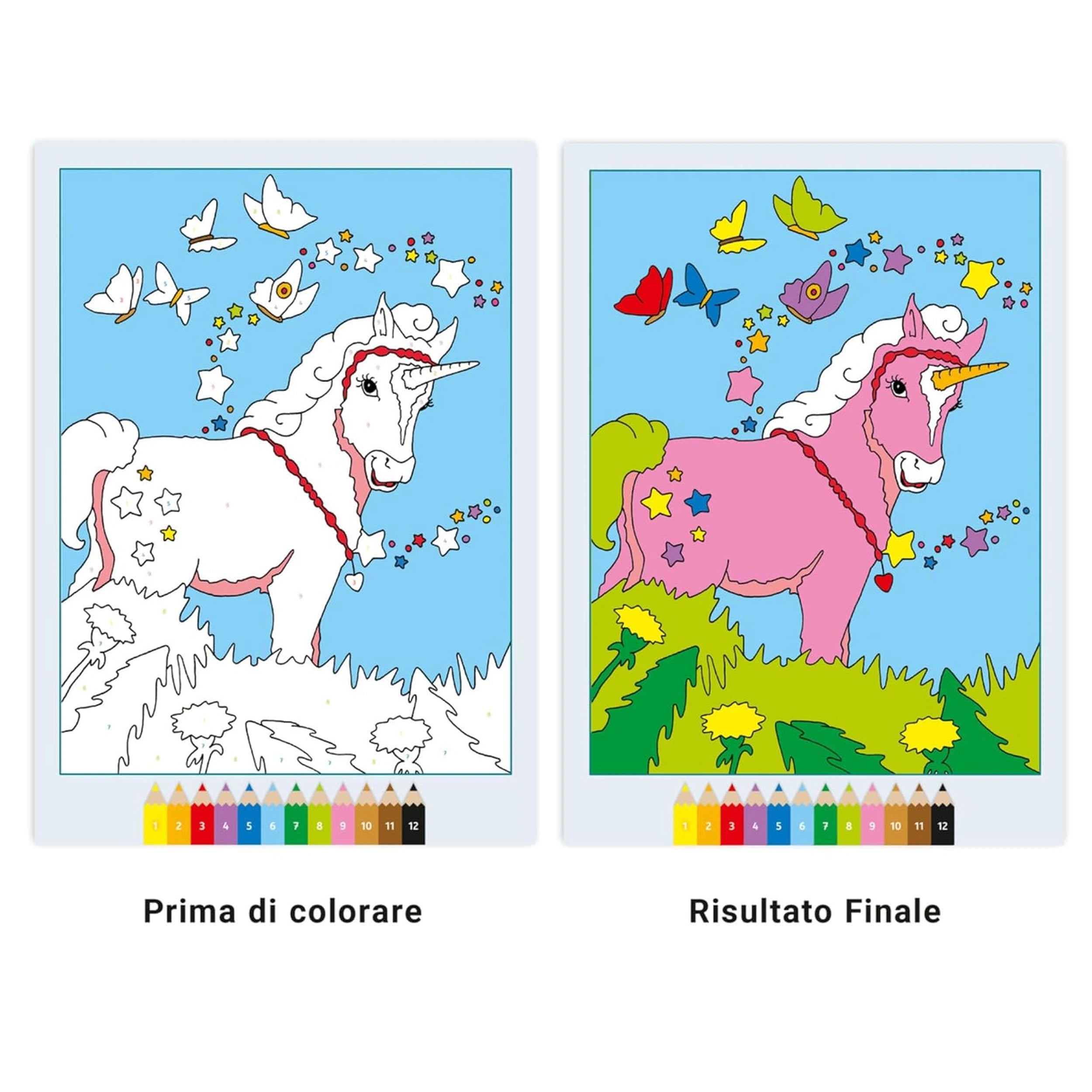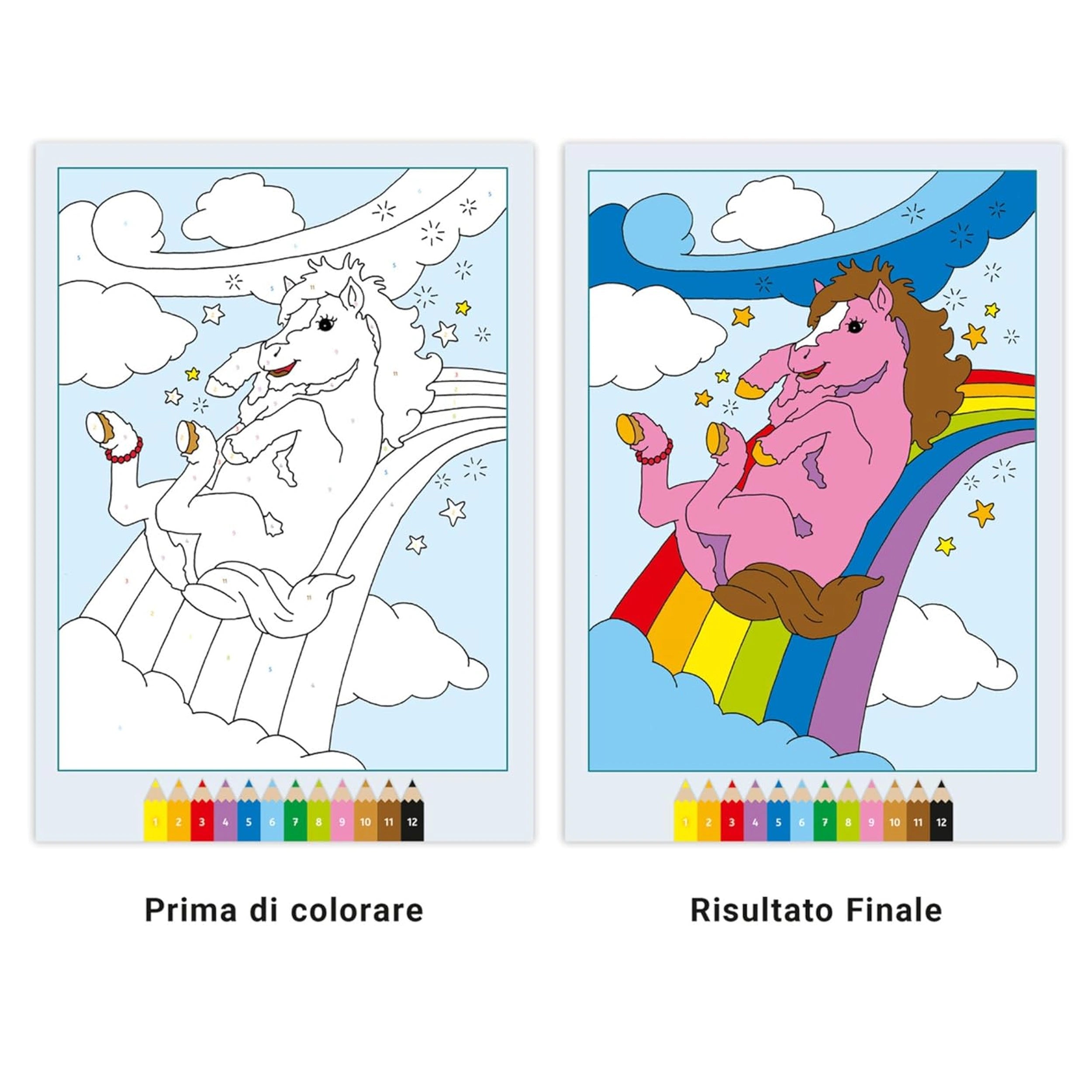 The Magic Ponies colouring book features a variety of delightful pony illustrations, each waiting to be brought to life with vibrant colours. Each area to be coloured is clearly marked with a number that corresponds to a specific colour, making it easy for children to follow along. The numbers are designed to be visible yet subtle enough to disappear once the artwork is complete, ensuring that the final product is a beautiful masterpiece. This step-by-step process allows children to create intricate and detailed images, fostering a sense of accomplishment and pride in their artistic abilities.