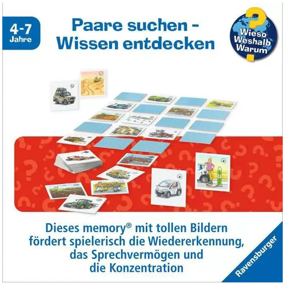 Introducing the Ravensburger - How Come For What Reason Why Vehicles Memory Board Game, a delightful and engaging game designed for young vehicle enthusiasts aged four and up. This unique memory game takes a fresh approach by focusing not just on matching identical images, but on pairing vehicles with their respective environments. Children will explore the world of tractors plowing fields and campers heading to the great outdoors, all while developing their memory skills in a fun and interactive way.