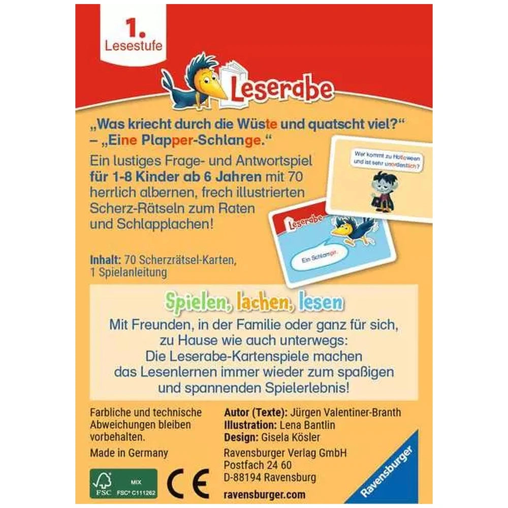 Introducing the Ravensburger - Leserabe: Scherz-Rätsel Card Game, a delightful educational tool designed to make reading an enjoyable experience for children. This engaging card game is specifically tailored for first graders, providing a fun and interactive way to enhance their reading skills. With its vibrant illustrations and captivating content, the Leserabe is perfect for both home use and on-the-go entertainment, ensuring that learning never feels like a chore.