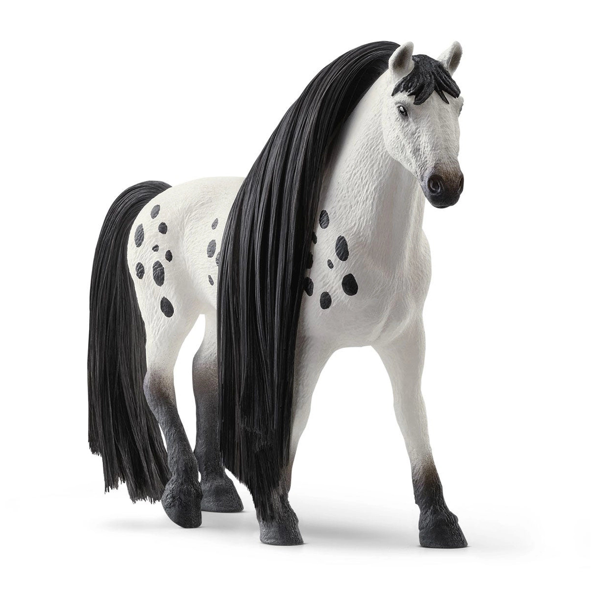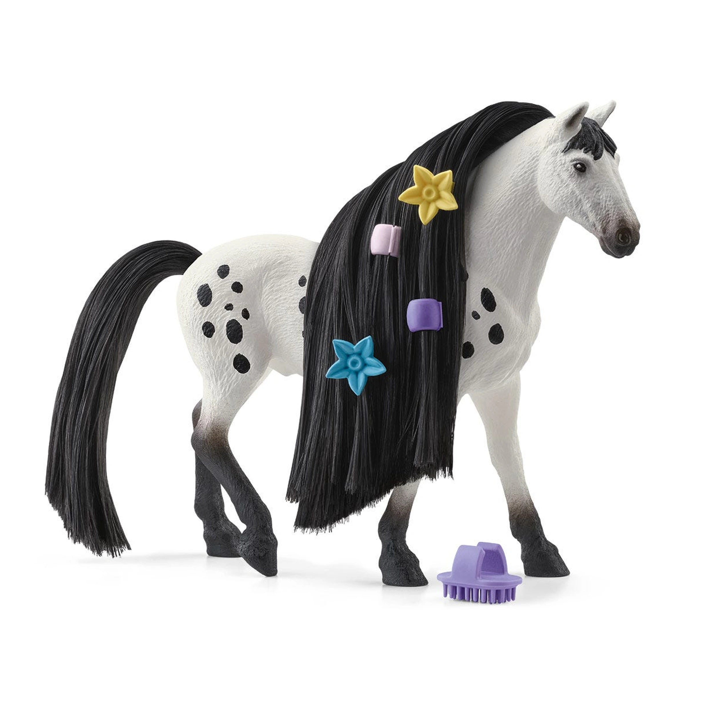 The Beauty Horse Knabstrupper Stallion is more than just a visually appealing figure; it offers a unique interactive experience. Children can express their creativity by decorating the stallion with hair beads and flowers, making each play session a personalized adventure. The option to swap the mare's mane and tail with interchangeable Schleich® hair kits (sold separately) adds an extra layer of fun, allowing kids to experiment with different styles and looks. Whether opting for a chic braided hairstyle or a simple yet elegant design, the possibilities are endless.