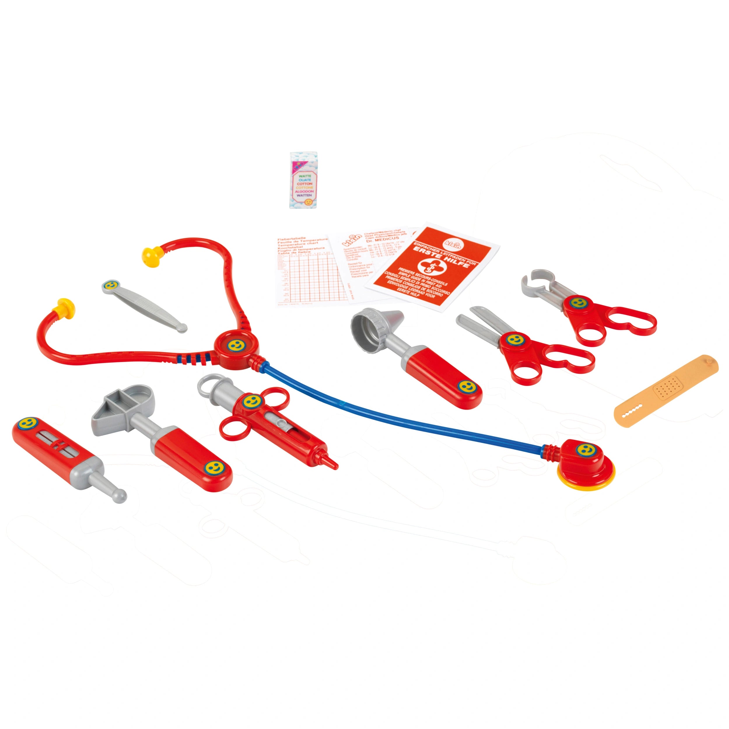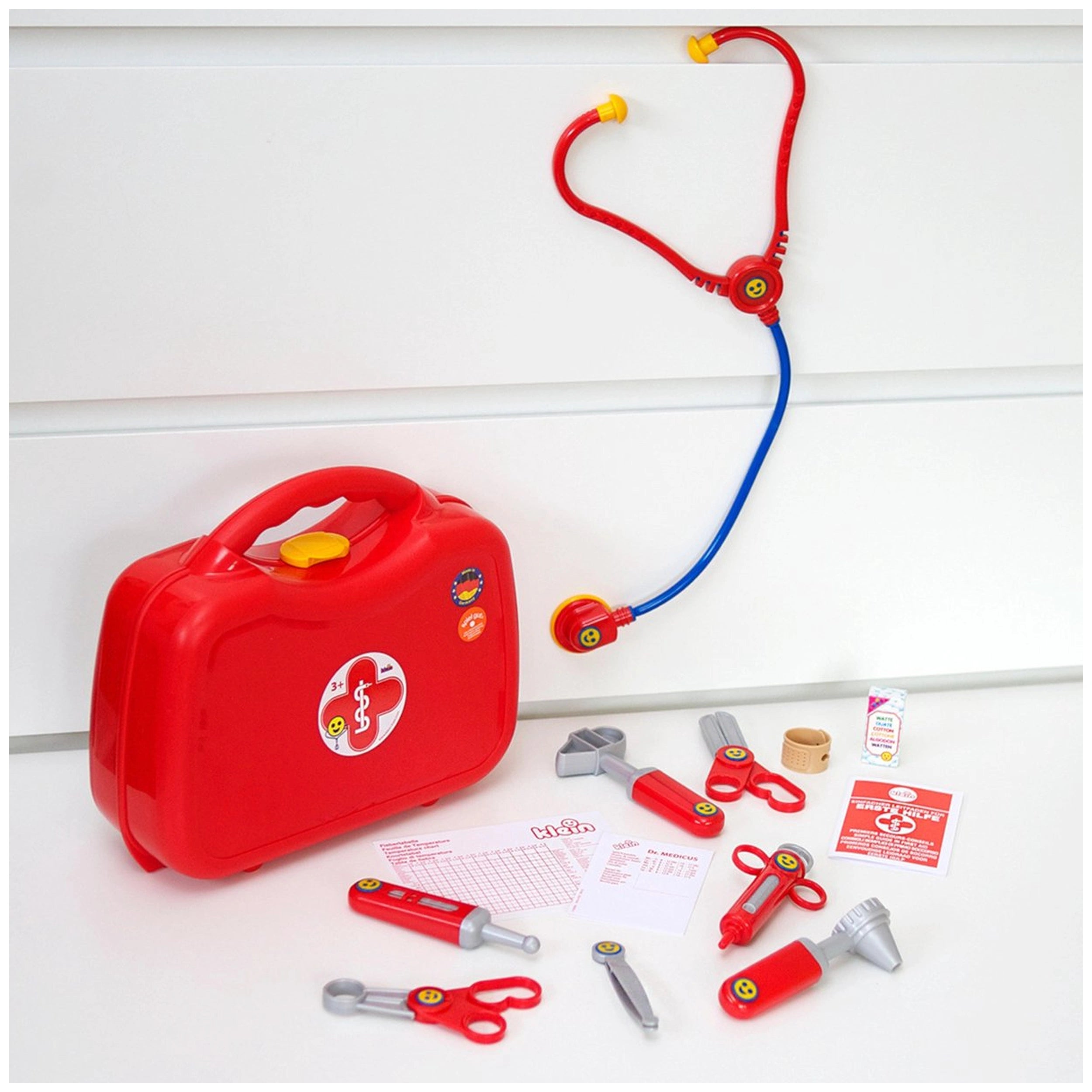 The Theo Klein Doctor Case is equipped with an array of realistic medical instruments, including a thermometer, stethoscope, syringe, ear speculum, and even a reflex hammer. Each tool is thoughtfully designed to fit comfortably in little hands, promoting dexterity and fine motor skills as children engage in pretend play. The rounded corners and practical handle of the case ensure safety and ease of use, making it an ideal choice for young children eager to help their dolls and stuffed animals feel better.