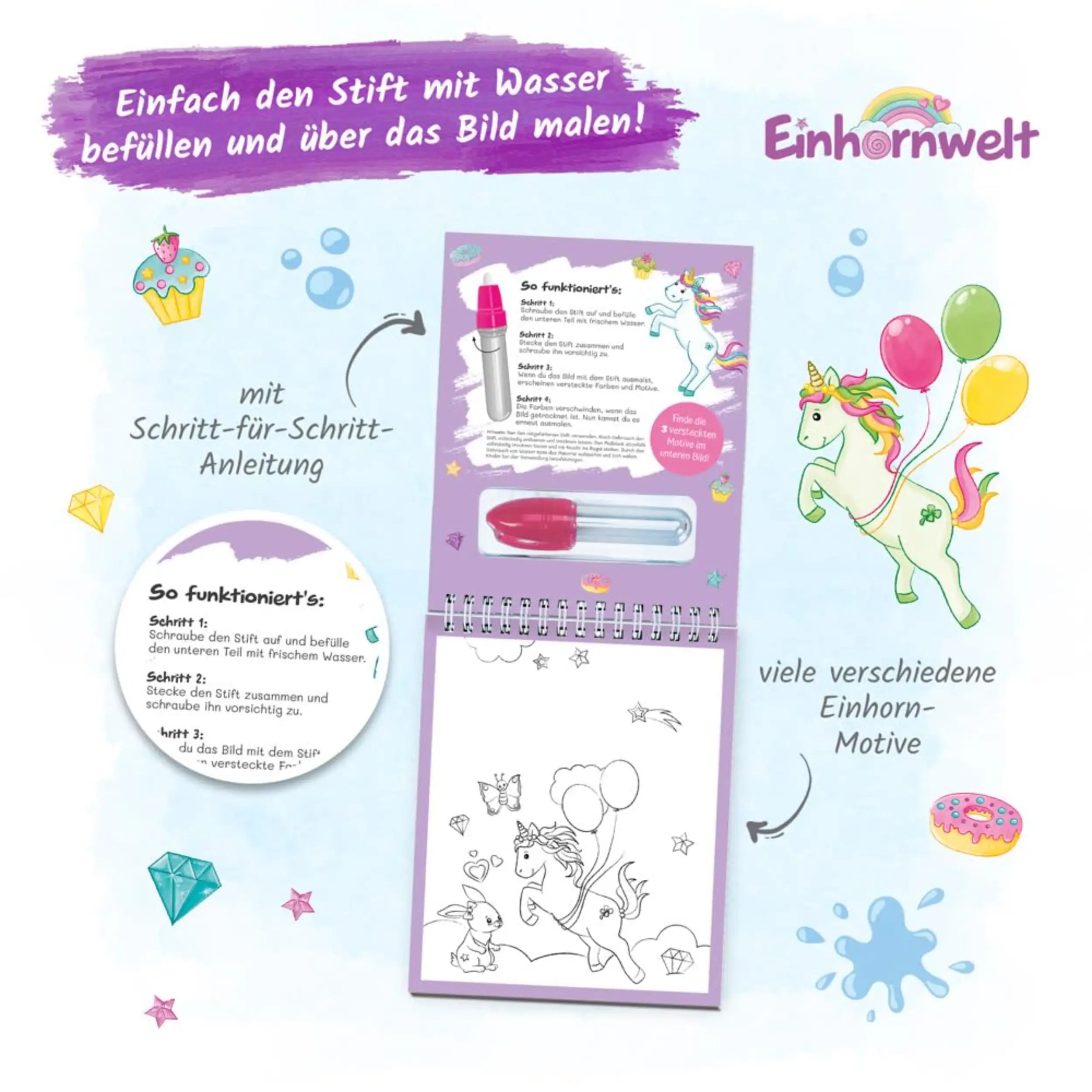 The Wassermalspaß "Einhornwelt" features a collection of beautifully illustrated pages, each showcasing delightful unicorn-themed motifs. Children can easily fill the included magic brush with water and watch as vibrant colors and hidden images emerge with each stroke. This interactive approach not only captivates young imaginations but also encourages fine motor skills and hand-eye coordination, making it an excellent educational tool as well.